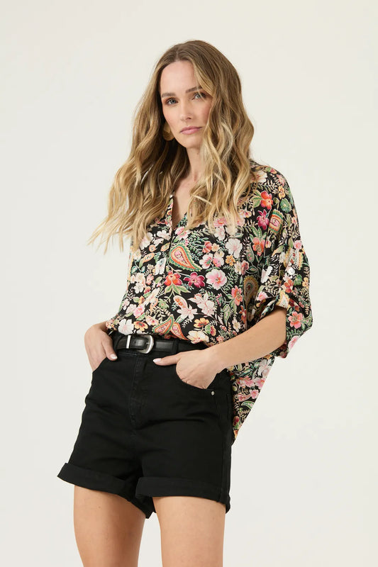 Blusa Mujer Manga Corta Cuello Mao Negro