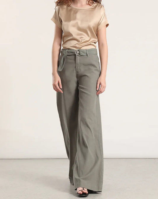 Pantalon Mujer Palazzo Tiro Alto Con Proceso Lyocell Lino Militar