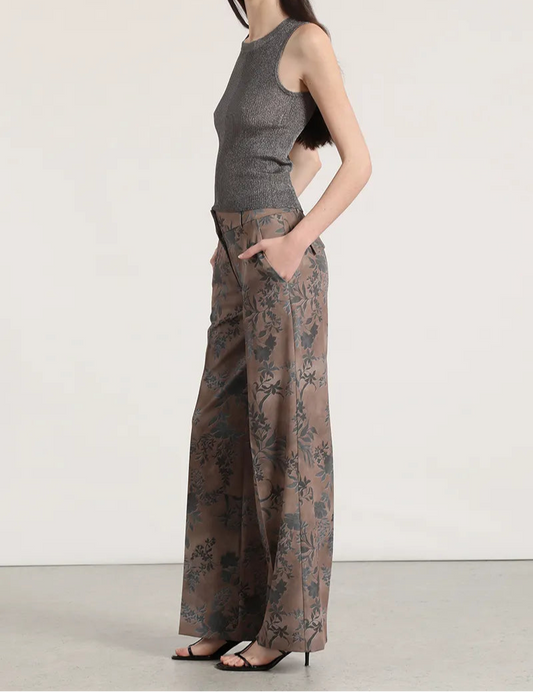 Pantalon Mujer Ancho Tiro Alto Estampado Cafe