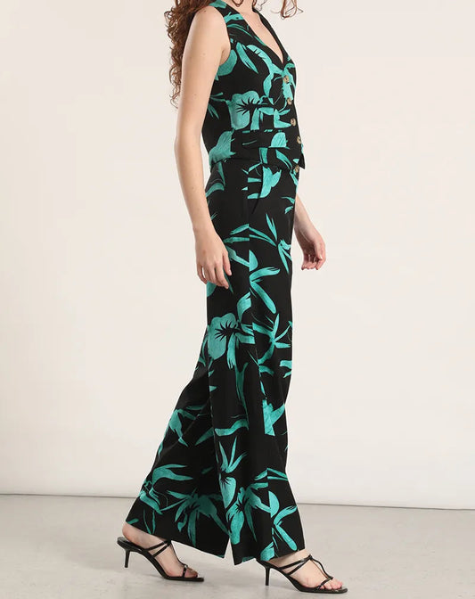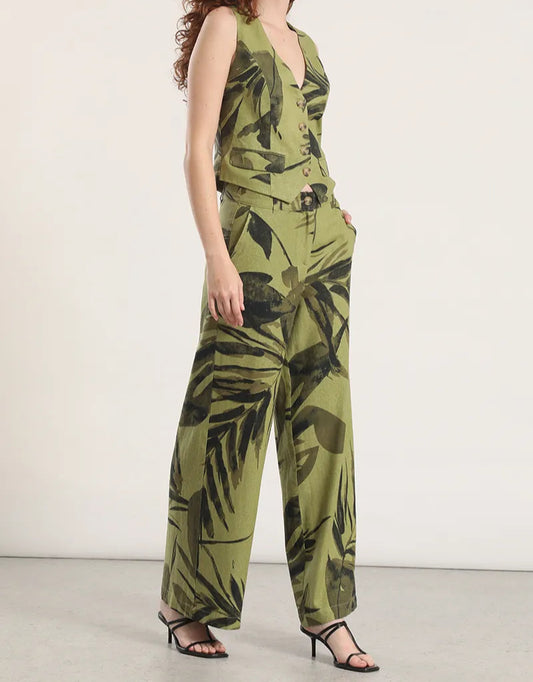 Pantalon Mujer Ancho Tiro Alto Mezcla Lino Estampado Verde