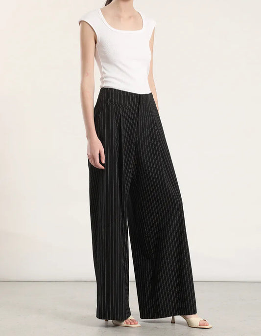Pantalon Mujer Ancho Tiro Alto Listado Negro