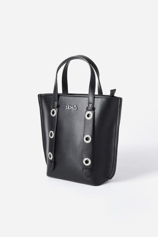Cartera Mujer Mediana Simil Cuero Granulado Ojetillos Strass Negro