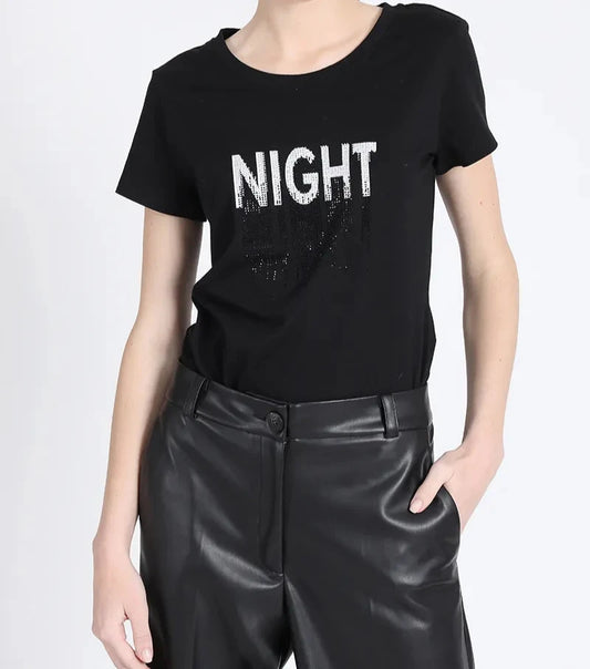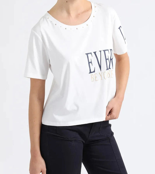 Polera Mujer Aplicación Tachas Y Estampado Texto Crudo