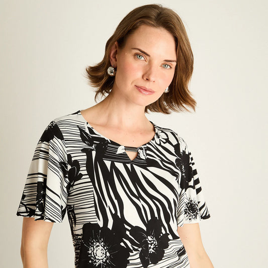 Polera Mujer Negra Estampada Manga Corta