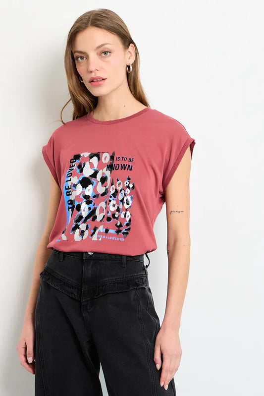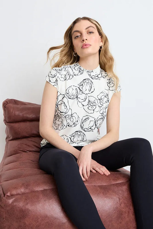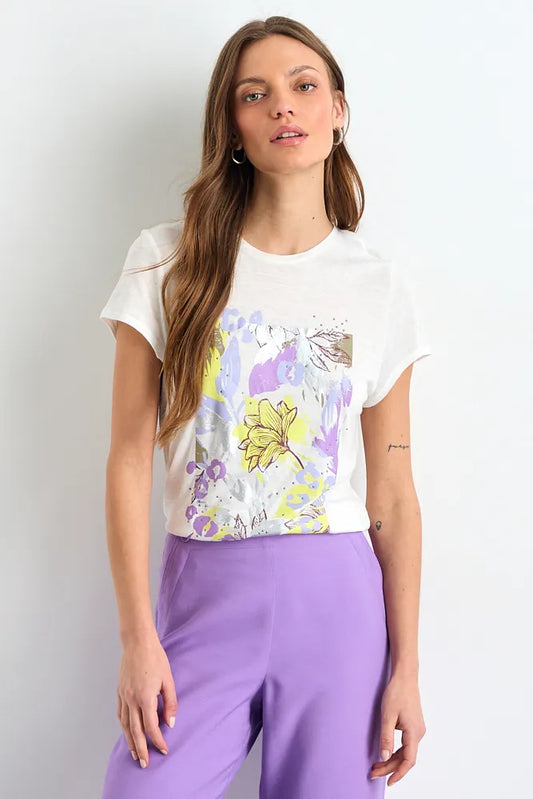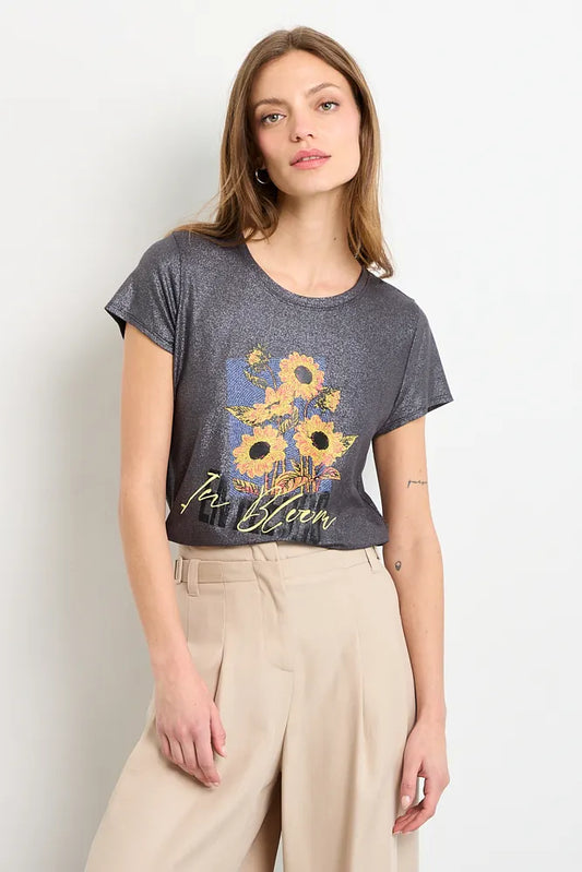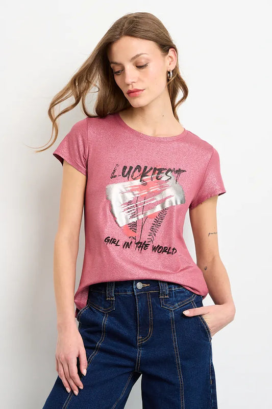 Polera Mujer Manga Corta Estampado Focal Con Tela Brillo Crudo