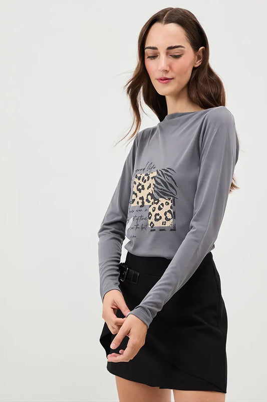Polera Mujer Modal Con Escote Drapeado Y Estampado Focalizado Gris Marengo