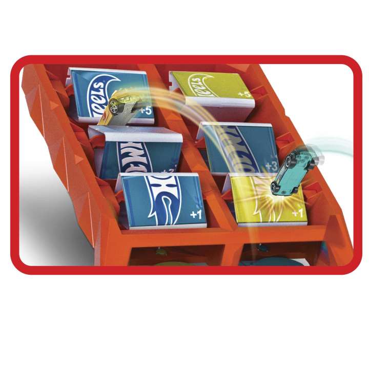 La pista Vueltas y Choques de Hot Wheels es una nueva y divertida forma de jugar con vehículos de metal y probar las habilidades de tus motores. Este set único es para 1 o 2 jugadores. Cada jugador debe lanzar sus vehículos hacia las fichas para voltearlas hasta que queden todas del mismo color, antes de que lo haga su oponente. Los jugadores pueden ajustar el lanzador para modificar la caída del vehículo o tomar un enfoque defensivo y tratar de aterrizar en el lado del otro jugador para cambiar el color de sus fichas en caso de que esté a punto de ganar. Si quieren disfrutar de un modo adicional de juego, pueden voltear la rampa hacia arriba para lanzar los vehículos por debajo de las fichas y voltearlas desde abajo.