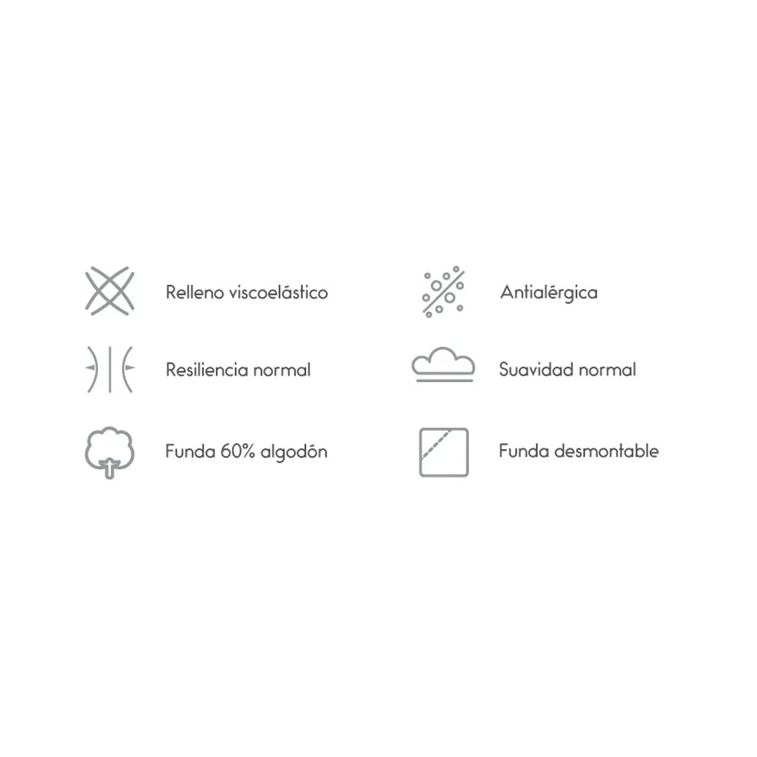 Si duermes de lado o de espalda y buscas el máximo confort, esta almohada es lo que necesitas. La calidad de sus materiales y su inigualable adaptación a los contornos y temperatura del cuerpo te garantizan placer y buen dormir durante toda la noche. Almohada antialérgica con relleno que se ajusta a la forma y peso de la cabeza, con funda desmontable con tejido semielásticado que ayuda al ajuste del relleno y se adapta a la temperatura del cuerpo. Destacada por su durabilidad. Mantiene su forma con el paso del tiempo de manera superior a las almohadas de relleno fibra. Mayor altura (más relleno).