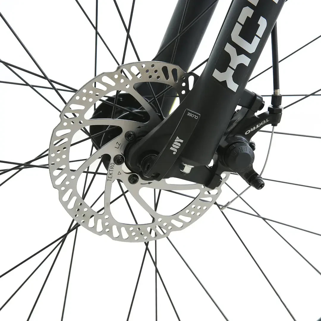 La bicicleta cuenta con un cuadro de aluminio y una horquilla SR Suntour XCT para mayor resistencia y comodidad. Su sistema de cambios incluye un desviador trasero Shimano RD-TY300 y delantero Shimano FD-M370, ofreciendo 27 velocidades para adaptarse a cualquier terreno. Además, está equipada con frenos de disco mecánicos que garantizan un frenado seguro y efectivo.