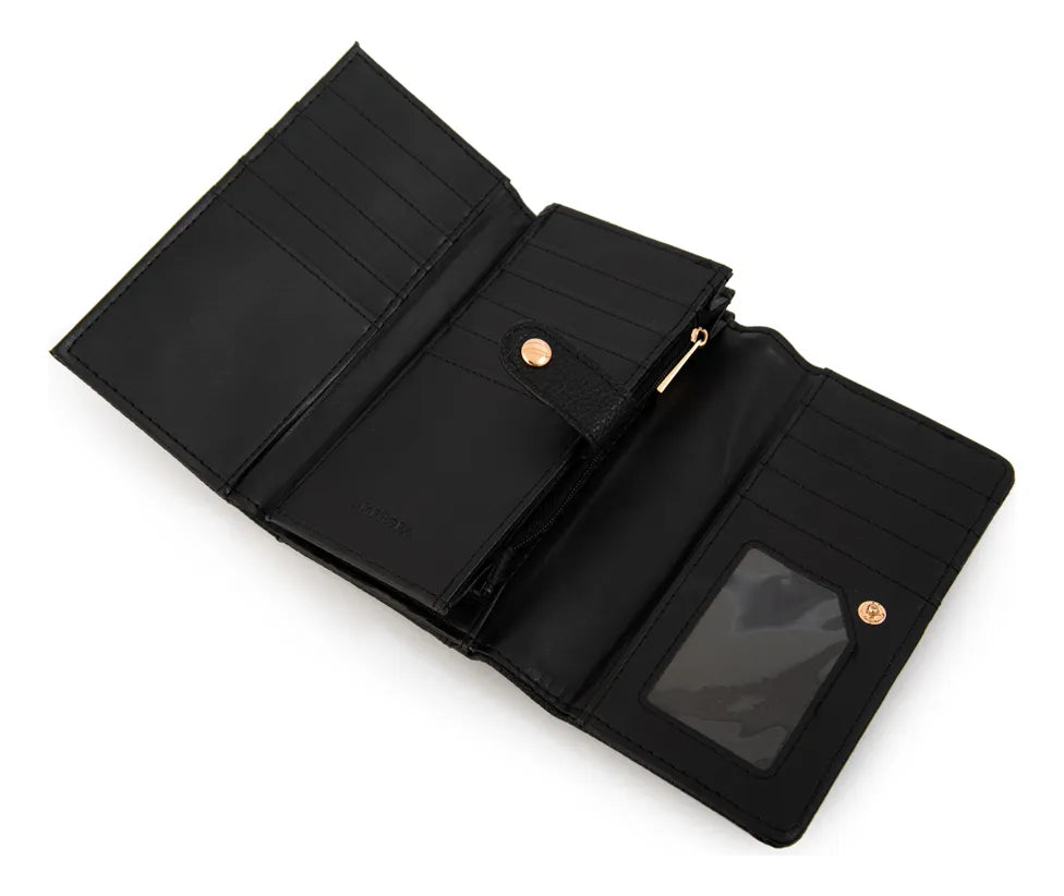Disfruta de mayor capacidad sin renunciar al estilo. La billetera Lizet negra mediana es ideal para quienes buscan espacio extra manteniendo la funcionalidad. Con cierre magnético y acabado en ecocuero, se convierte en un accesorio esencial para el día a día.