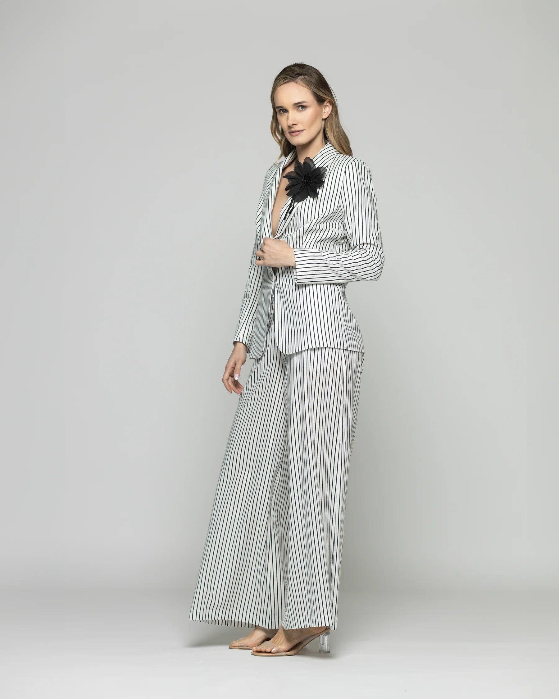 Este blazer largo para mujer combina clásico y modernidad con su textura luminosa y finas rayas negras sobre algodón. Su escote profundo y hombros estructurados realzan tu figura con elegancia, mientras el botón frontal y los bolsillos laterales aseguran funcionalidad discreta. El detalle de la flor negra le añade un toque único y sofisticado. Perfecto para transformar un outfit básico o para un look diario con estilo, este blazer es la prenda ideal para destacar con sutileza en cualquier ocasión.