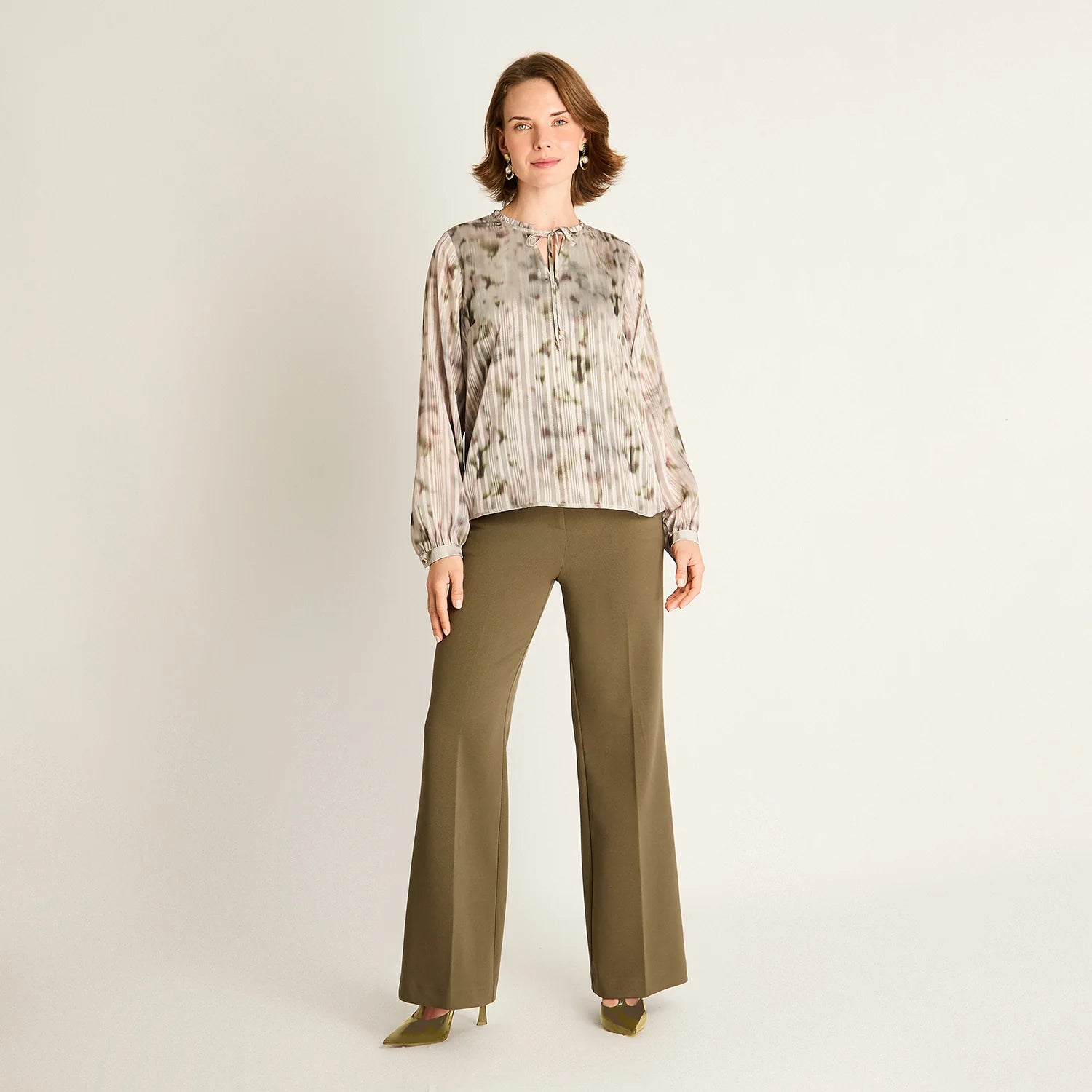 La Blusa Arena Estampada con Lazo de la colección Business Olive de Lorenzo di Pontti ofrece un equilibrio perfecto entre elegancia y comodidad. Su tejido 100% poliéster con forro interior garantiza un ajuste ligero y sin transparencias, adaptándose con naturalidad gracias a su calce normal. El diseño destaca por un cuello redondo con volante fruncido y un lazo ajustable, junto a mangas largas con puños fruncidos que aportan un toque romántico y sofisticado. Ideal para crear looks primaverales combinados con pantalones de vestir.