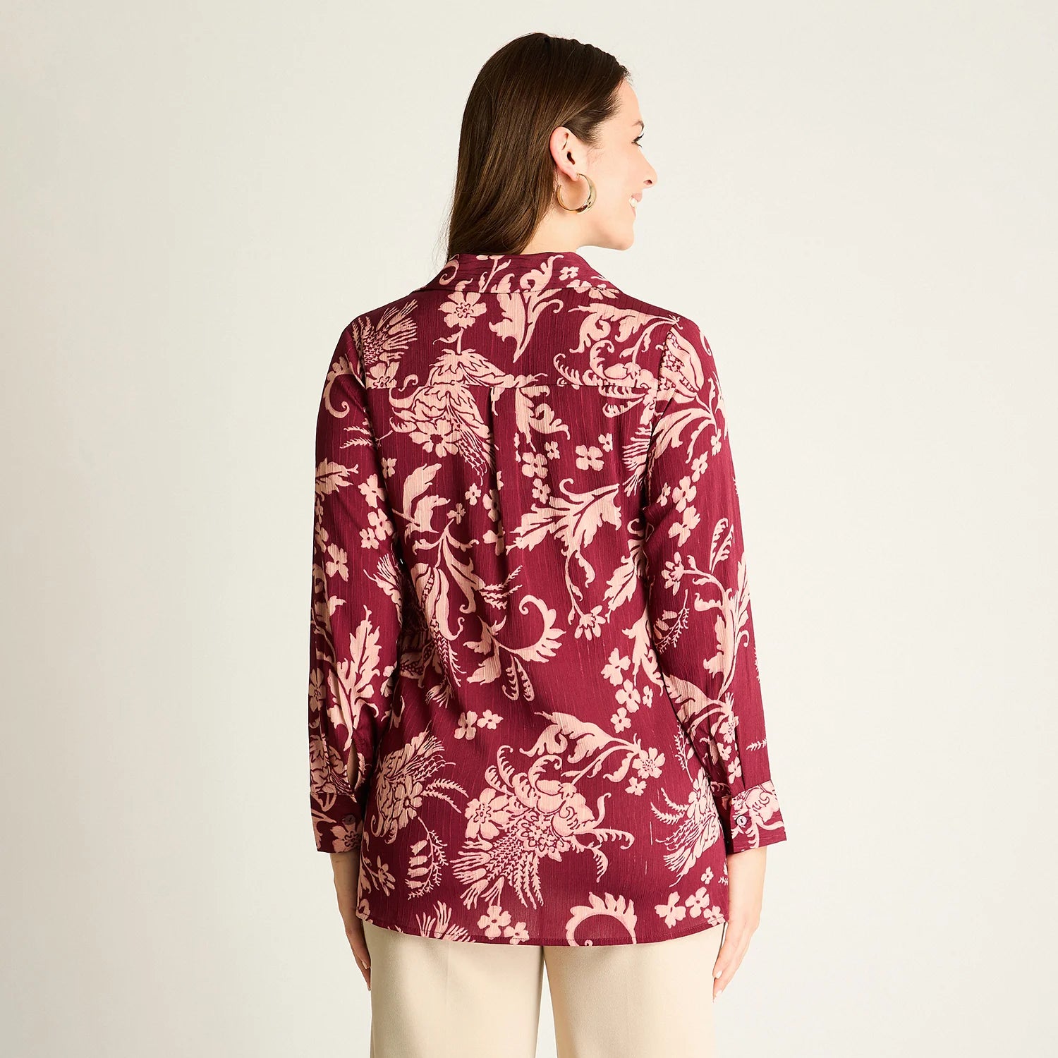 La Blusa Burdeo Estampada Manga Larga de la colección Cherry Lady combina un diseño floral vibrante con un calce normal que se ajusta cómodamente al cuerpo. Confeccionada en poliéster liviano, ofrece una caída fluida y frescura al usarla. Su cuello camisero y mangas largas con puño aportan elegancia y estructura, perfecta para un look sofisticado en días primaverales. Ideal para el trabajo o salidas casuales, su estampado único te permite destacar con estilo sin esfuerzo.