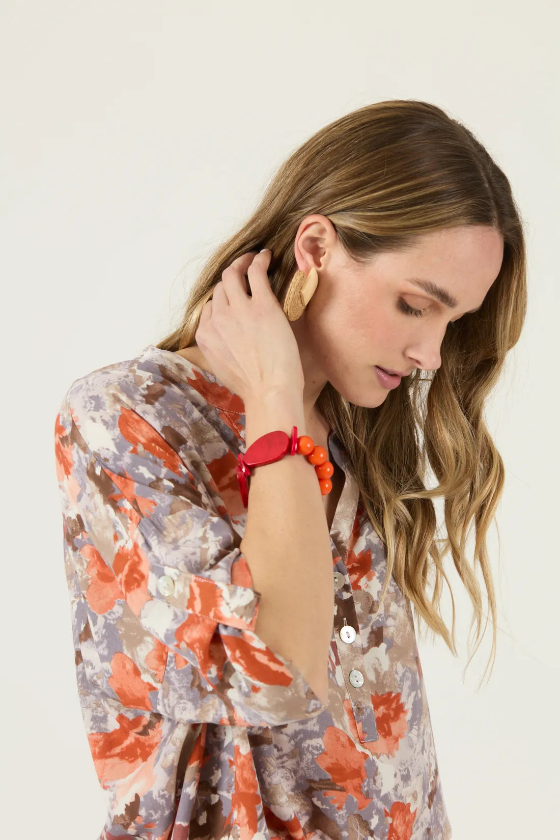 Esta blusa de manga corta para mujer, con cuello mao y estampado en tono naranjo, combina estilo y comodidad. Su corte regular se adapta perfectamente para un look casual, ideal para cualquier ocasión diaria. Confeccionada 100% en viscosa, ofrece una textura suave y fresca. Su cuidado es sencillo: lavado a mano o a máquina en ciclo suave con agua fría, y planchado delicado cuando la prenda aún está un poco húmeda para mantener su calidad y brillo. Añade un toque vibrante y cómodo a tu guardarropa con esta blusa versátil.