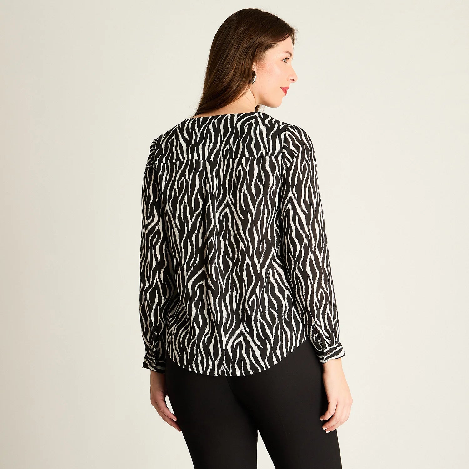 Destaca con sofisticación y personalidad esta blusa negra con estampado animal print de la colección Básicos de Lorenzo di Pontti. Su tejido 100% poliéster la hace ligera y cómoda, perfecta para climas templados. El escote redondo con abertura en V y detalle de botón, junto a las mangas largas y el calce normal, ofrecen un equilibrio ideal entre estilo audaz y comodidad atemporal. Añade a tu guardarropa una prenda versátil que realza tu look con un toque moderno y elegante.