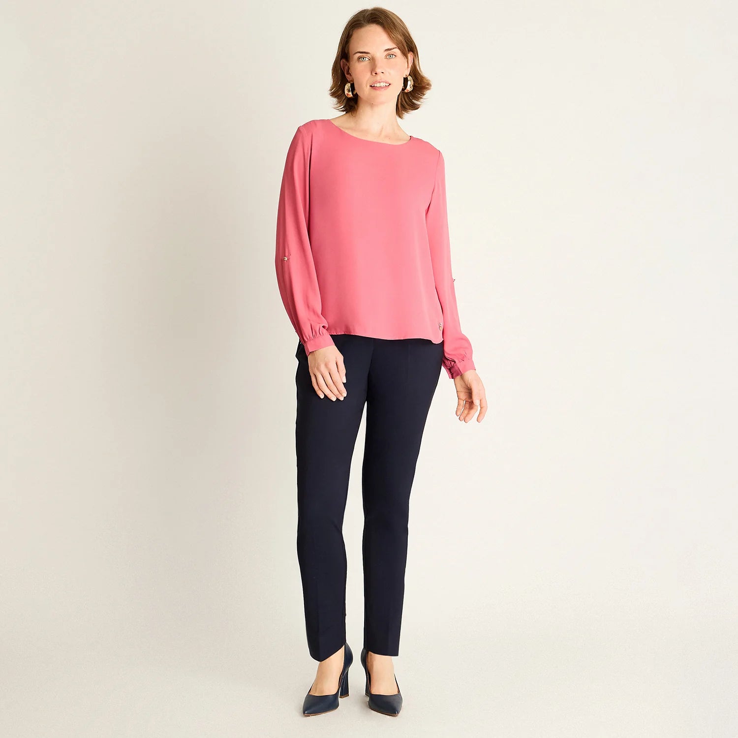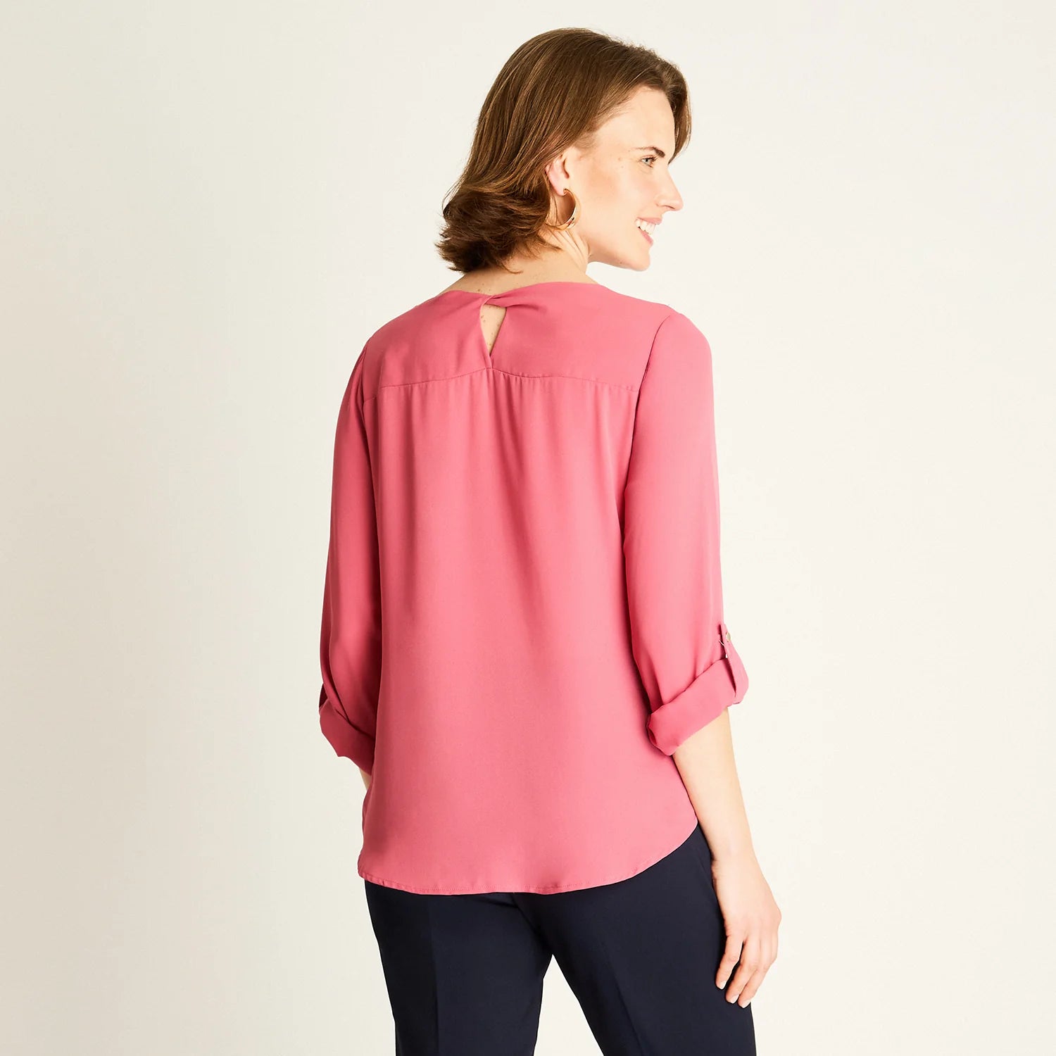 Esta blusa rosada de manga 3/4 con detalle roll-up combina frescura y sofisticación para tu día a día. Su tejido 100% poliéster ofrece ligereza y comodidad, mientras que el diseño con escote redondo y abertura en forma de lágrima en la espalda aporta un toque femenino y práctico. Perfecta para mantener un estilo versátil, ideal tanto para la oficina como para actividades al aire libre. Con ella, disfrutarás de libertad de movimiento sin renunciar a la elegancia.