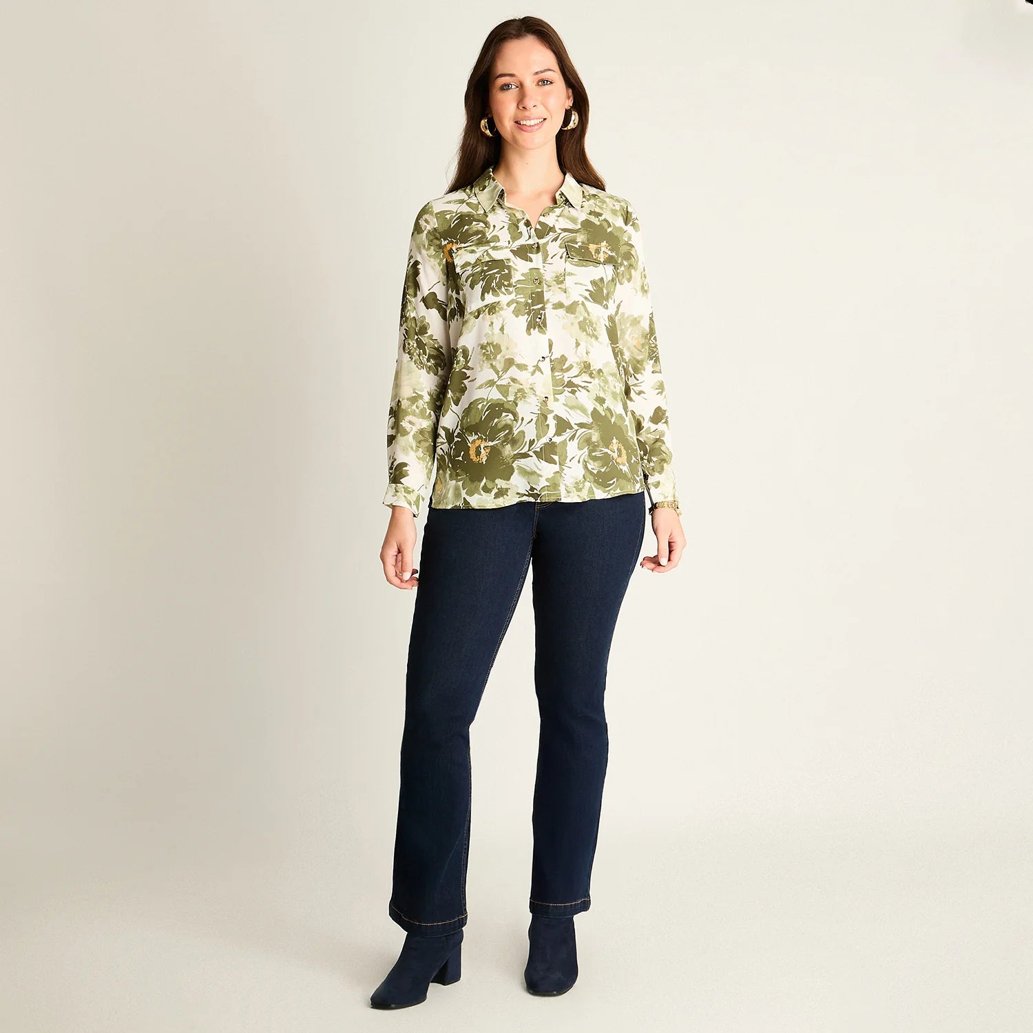 Actualiza tu guardarropa primaveral con esta blusa verde de estampado floral de Lorenzo di Pontti. Fabricada en 100% poliéster, ofrece una caída ligera y fresca, perfecta para esos días templados. Su cuello camisero, mangas largas con ajuste roll-up y bolsillos frontales con solapa combinan funcionalidad y estilo, mientras que su calce normal garantiza comodidad y libertad de movimiento. Ideal para looks casuales o más sofisticados, esta prenda es un reflejo de energía natural y elegancia sencilla.