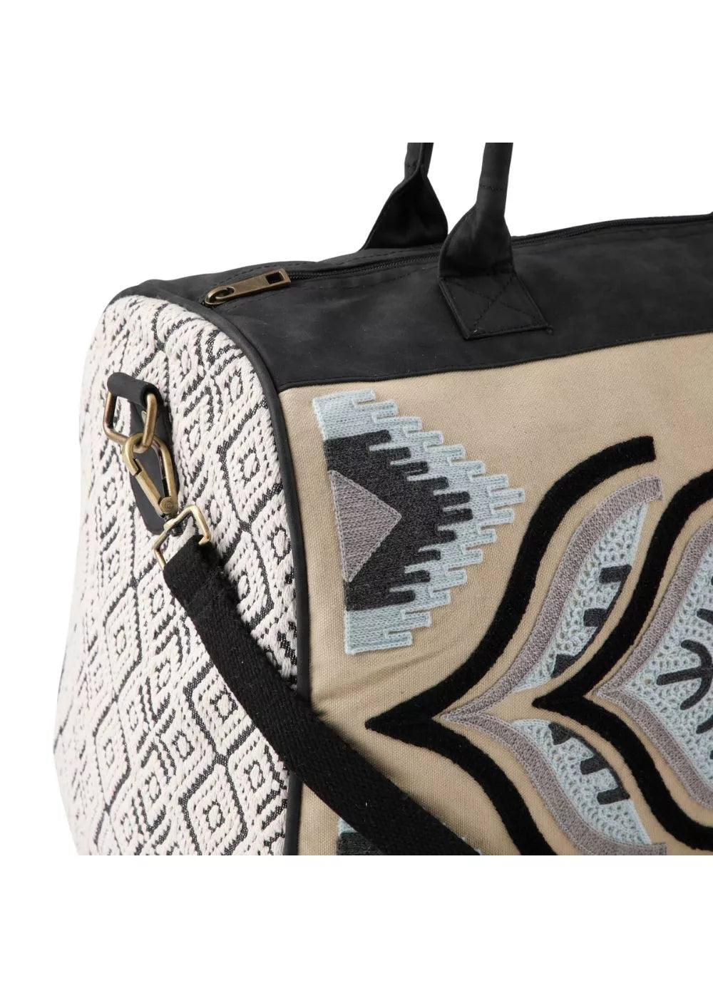 Este bolso de canvas beige destaca por sus elegantes diseños tejidos en azul y gris, complementados con patrones laterales en blanco y plateado. Cuenta con dos asas de ecocuero negro y una correa ajustable y desmontable para mayor comodidad. En su interior, dispone de un bolsillo con cierre, mientras que los detalles metálicos en dorado oscuro aportan un toque sofisticado. Ideal para quienes buscan estilo y funcionalidad en un accesorio único.