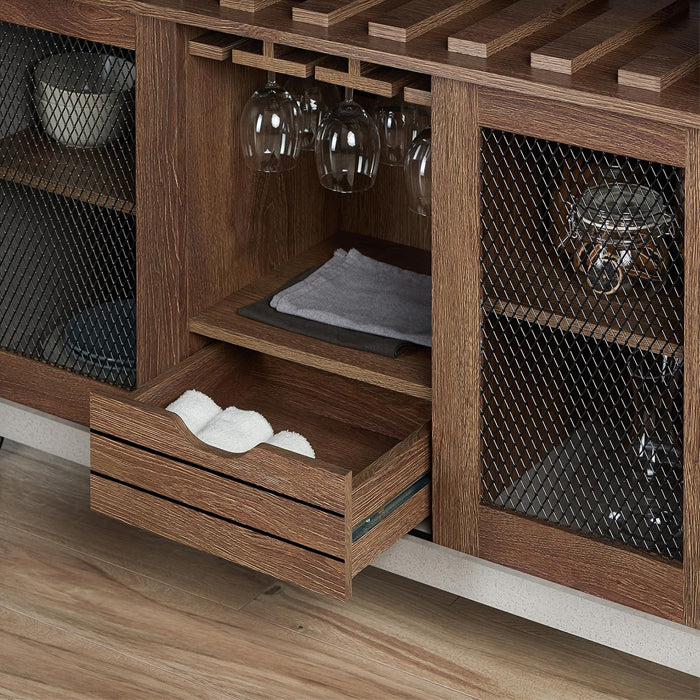 El Buffet Bar Brown combina un diseño industrial inspirado en el cemento con un acabado elegante y contrastante. Su espacioso estante exhibe la botella de vino con estilo, mientras que los estantes de vidrio mantienen las copas siempre a mano. Los gabinetes con paneles de malla ofrecen amplio almacenamiento con estantes escalonados, y un cajón central brinda espacio extra para tus accesorios de bar. Además, sus ruedas giratorias facilitan su movilidad, integrando funcionalidad y estilo versátil a cualquier espacio de tu hogar. Medidas: 120 cm largo, 39.6 cm ancho, 80 cm alto.