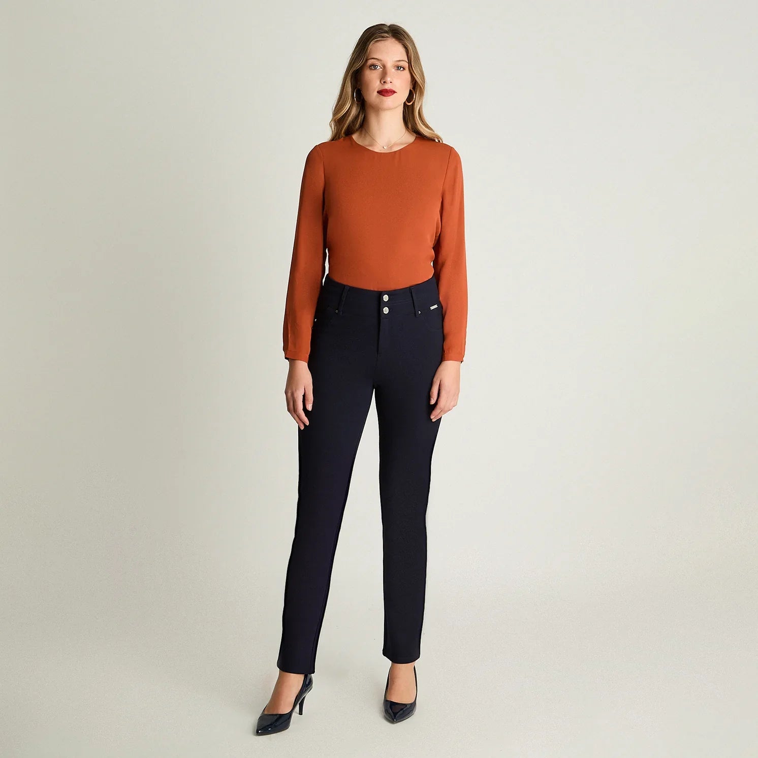 Calza de corte recto en azul marino que combina estilo y comodidad para tu día a día. Fabricada con una composición de 65% viscosa, 30% poliamida y 5% spandex, proporciona un ajuste ergonómico con elasticidad controlada y una textura suave al tacto. Los dos botones decorativos frontales añaden un detalle sofisticado que eleva cualquier conjunto. Versátil y resistente, se adapta perfectamente a blusas, camisas y tops variados. Marca Lorenzo di Pontti, modelo 71001039, colección Toda Temporada. Una prenda diseñada para ofrecerte seguridad y elegancia en cada momento.