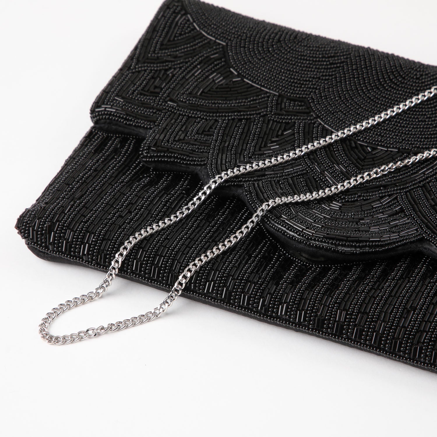 Elegante cartera clutch rectangular en tela negra, equipada con una cadena plateada y cierre magnético. Su diseño frontal destaca por un delicado patrón floral elaborado con mostacillas negras, ideal para complementar tu look de fiesta con un toque sofisticado.