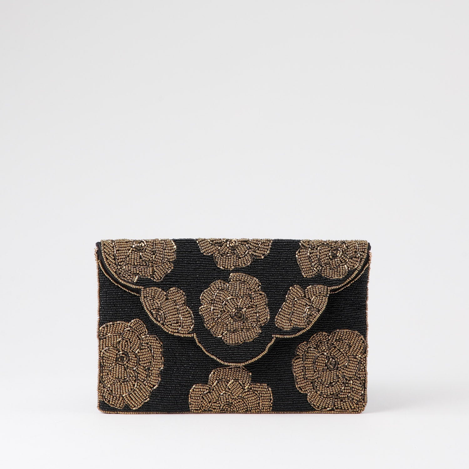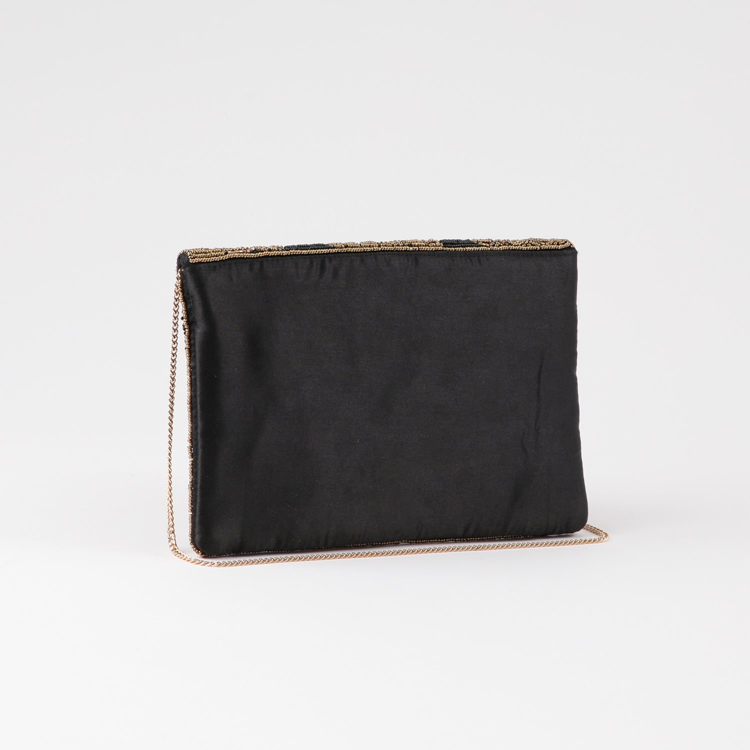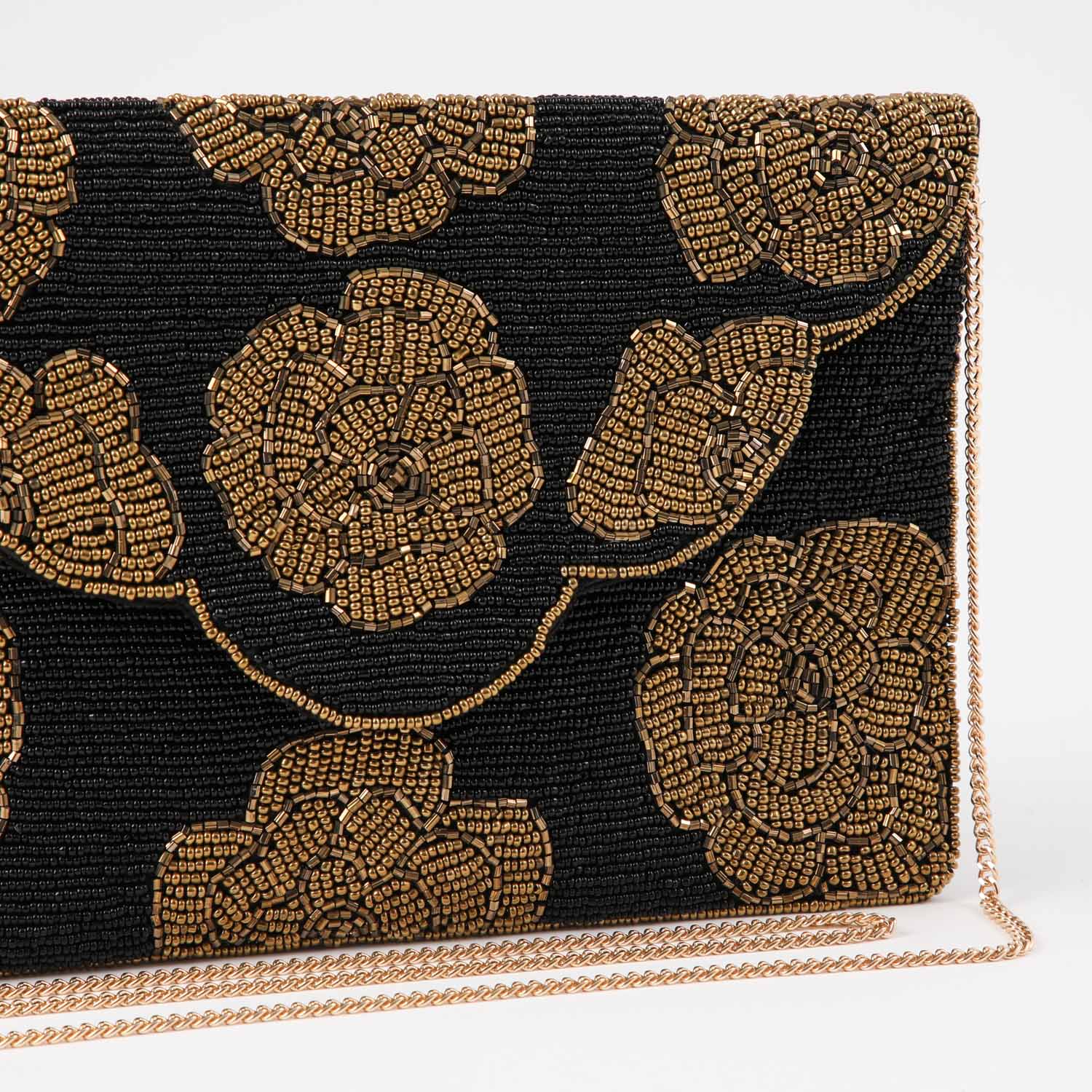 Esta cartera rectangular tipo clutch está confeccionada en tela negra y cuenta con una elegante cadena dorada y cierre magnético. Su diseño frontal presenta un delicado patrón de flores elaborado con mostacillas negras y doradas, ideal para complementar tus atuendos de fiesta con un toque sofisticado.