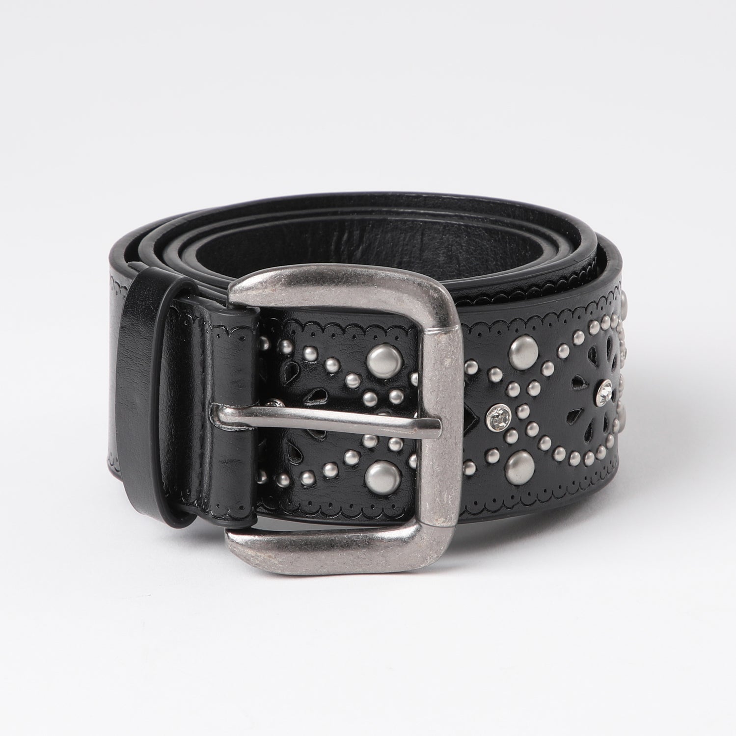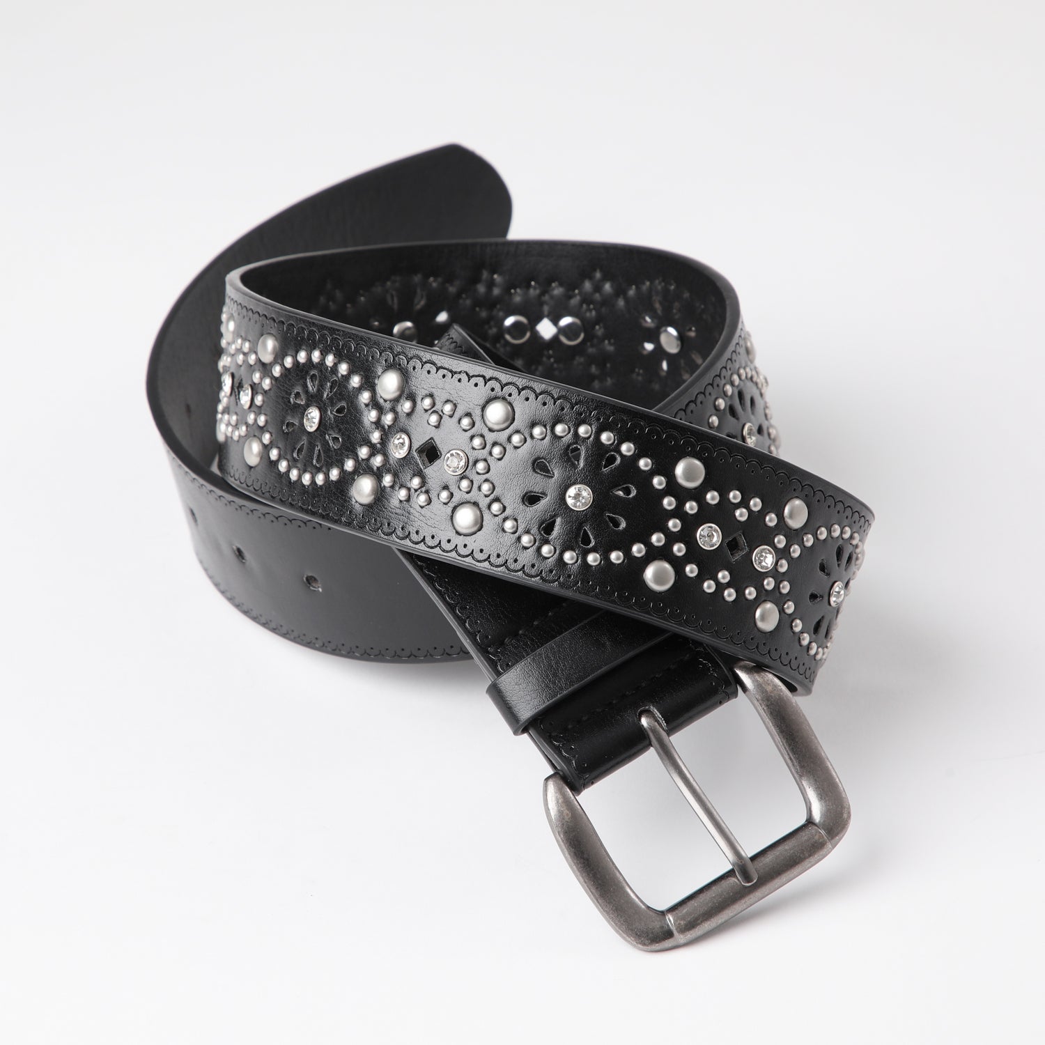 Este cinturón de ecocuero negro mide 110 cm y destaca por sus adornos metálicos en variados diseños: tachas pequeñas y grandes formando óvalos, brillantes medianos con acabado fantasía, detalles tipo gota recortados y figuras en rombo. Su hebilla rectangular, sólida y discreta, junto con los accesorios metálicos plateados, aportan un toque moderno y elegante a cualquier atuendo.