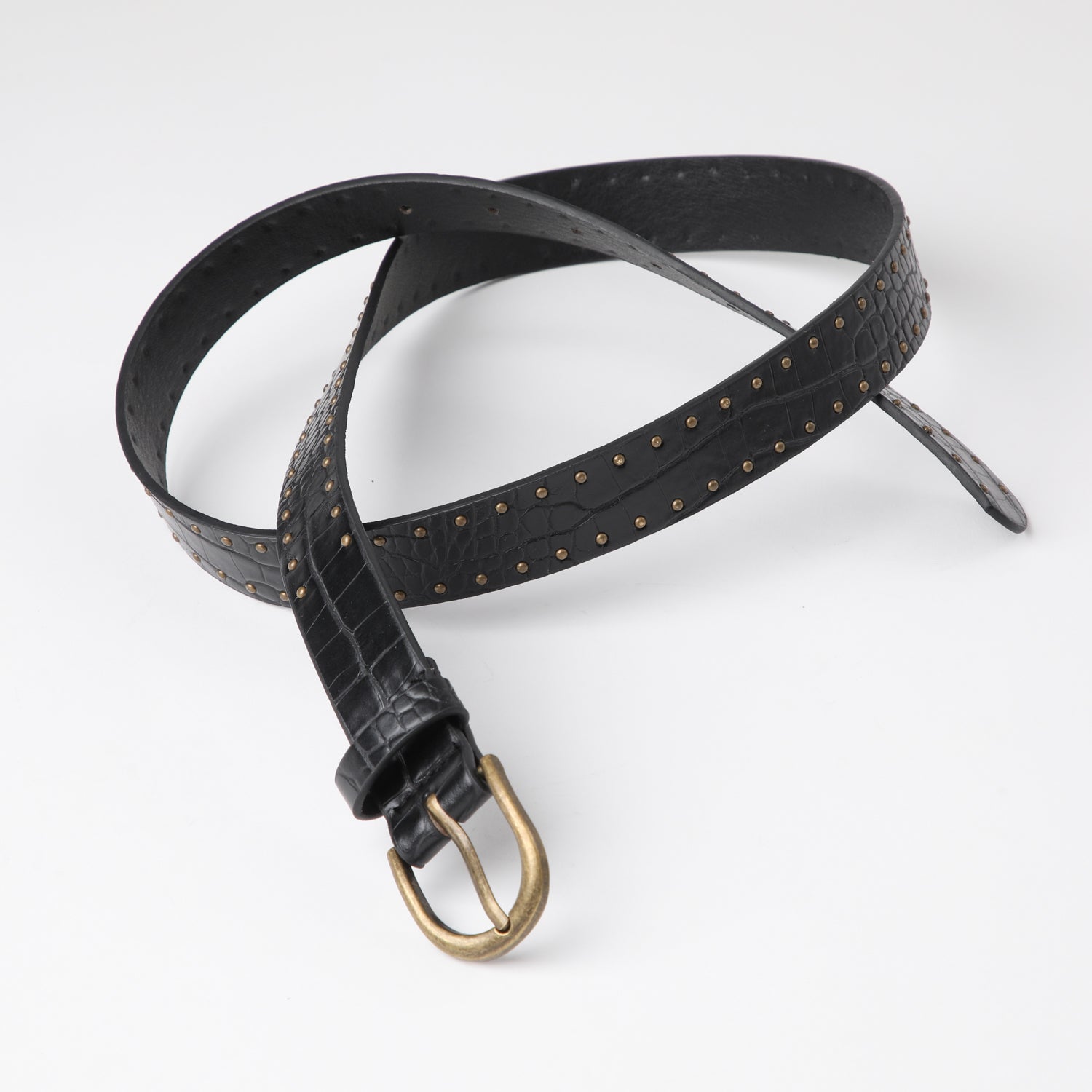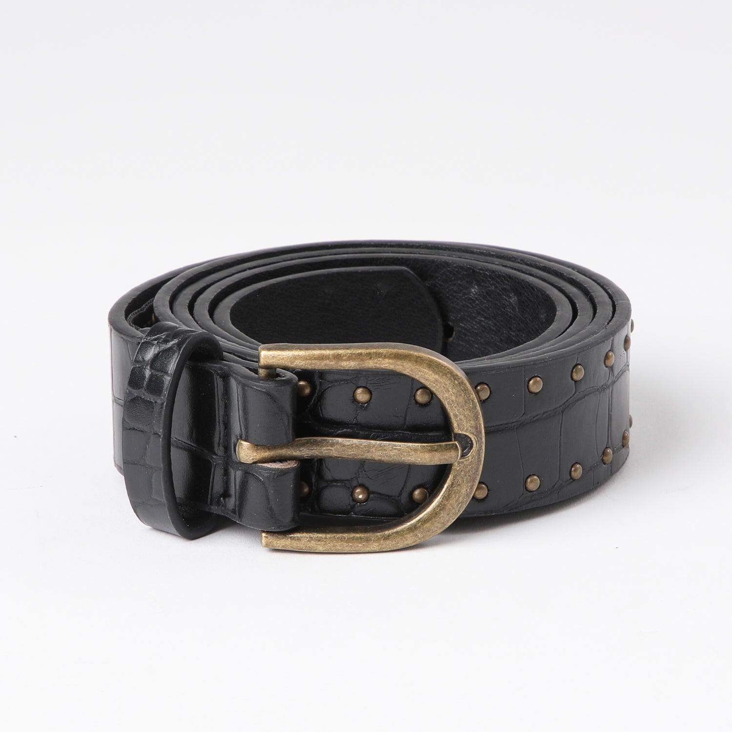 Este cinturón de ecocuero negro presenta una textura que imita la piel de cocodrilo y mide 110 cm de largo. Cuenta con dos filas de pequeñas tachas a lo largo de los bordes, mientras que su hebilla, compacta y redondeada, junto con las tachas, está acabada en un moderno metal plateado oscuro. Perfecto para darle un toque elegante y atrevido a cualquier conjunto.