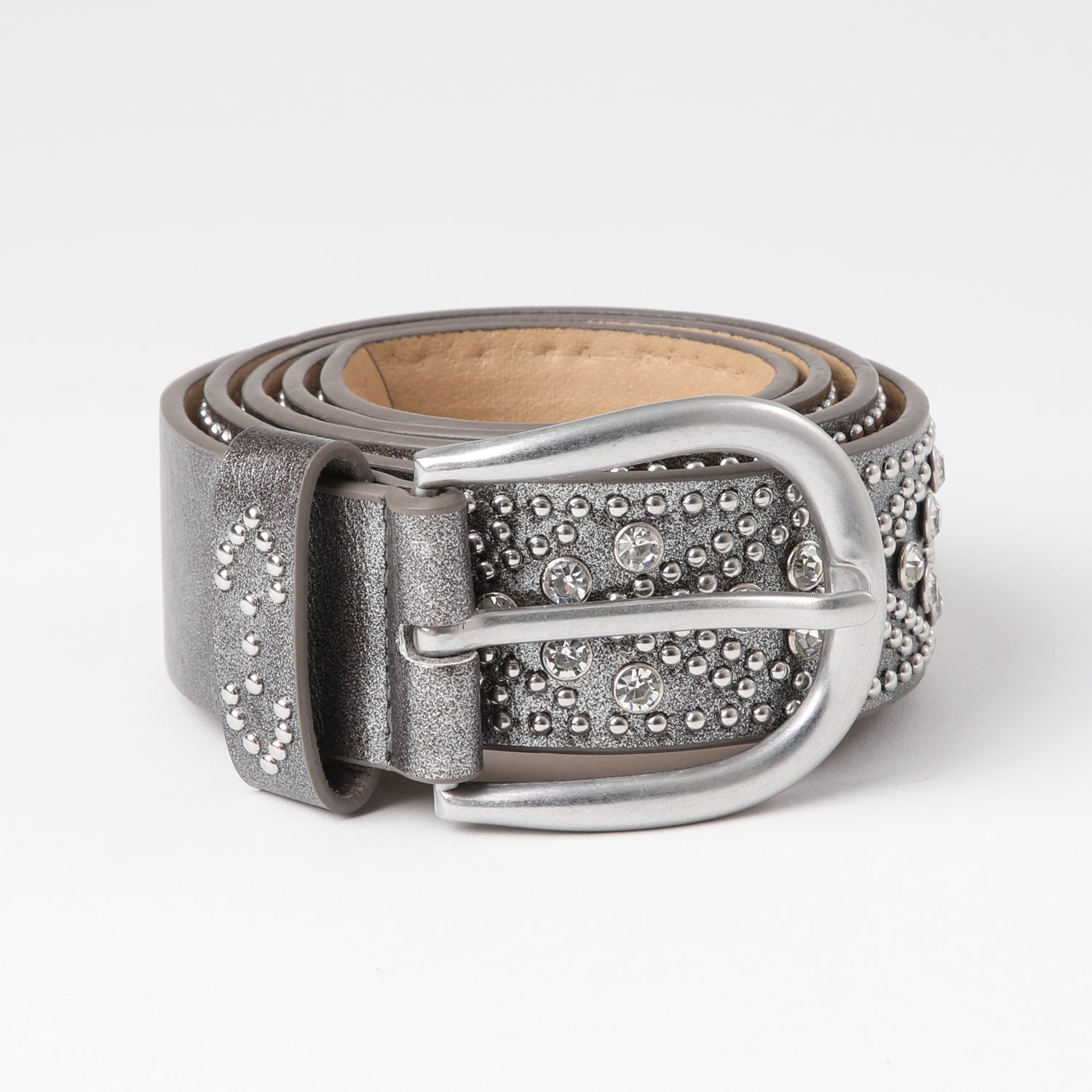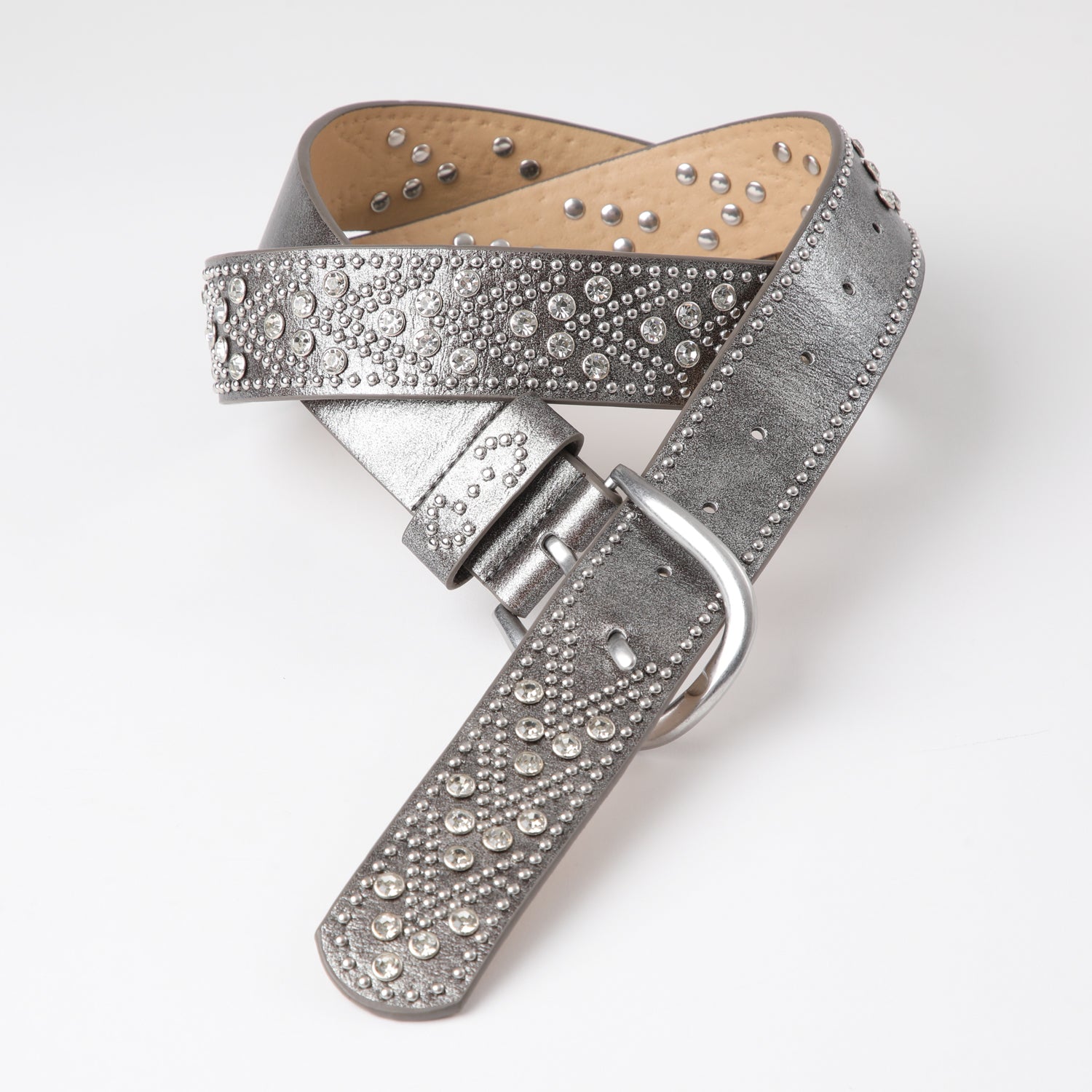 Cinturón de ecocuero plateado de 110 cm, diseñado con tachas medianas y grandes brillantes en un patrón de flechas, complementadas por tachas paralelas en los bordes. Su hebilla mediana y robusta, junto con las tachas y brillantes, están fabricadas en metal plateado, aportando un estilo moderno y llamativo.