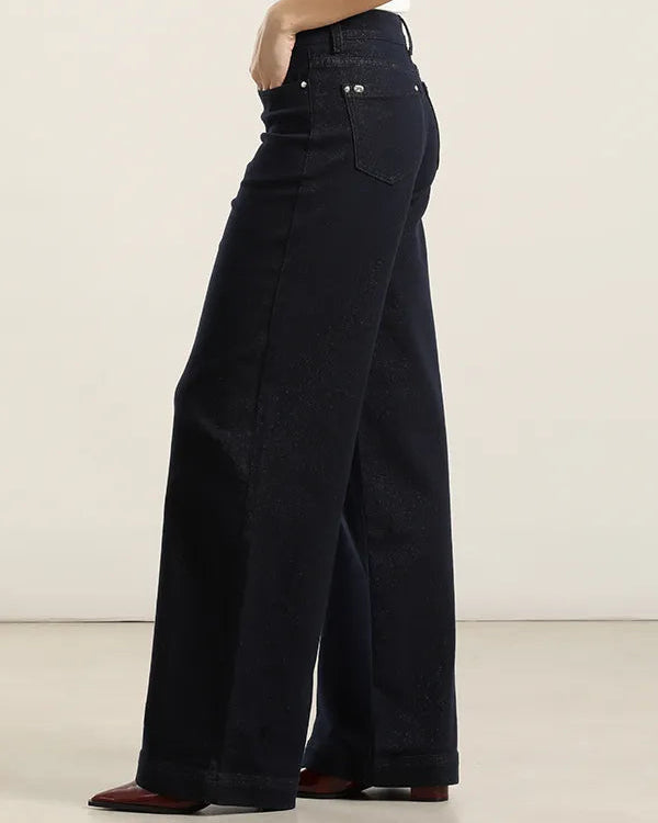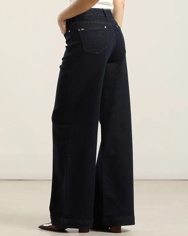 Pantalón palazzo confeccionado en denim con detalles lurex que añaden un toque de brillo sutil. Presenta un tiro medio clásico, pretina estructurada con pasadores, cierre frontal con botón y cinco bolsillos funcionales. La composición de algodón, poliéster, lyocell y elastano proporciona comodidad y durabilidad. Se recomienda lavar en agua fría con detergente neutro, planchar a temperatura media por el revés y evitar centrifugado y lavado en seco para mantener sus características.