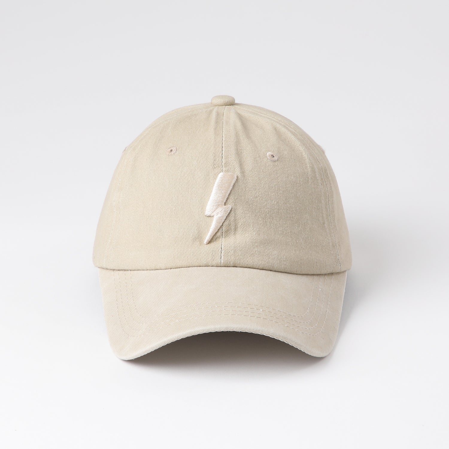 Jockey en tono beige desgastado, decorado con un rayo gris claro brillante bordado en el frente. Cuenta con una hebilla ajustable en la parte posterior para un ajuste perfecto.