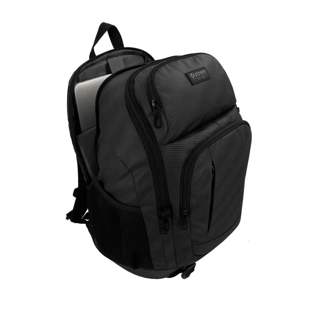 La Mochila Prescott Negra es una solución de transporte diseñada para profesionales que requieren protección y funcionalidad. Con capacidad para 35 litros y compartimento dedicado para laptops de 16", ofrece espacio suficiente para equipamiento diario. Su exterior de poliéster repelente al agua protege el contenido en diversas condiciones climáticas, mientras que el forro elaborado con botellas recicladas refleja un compromiso con la sostenibilidad. Incluye bolsillo de seguridad, compartimento para botella, correa de esternón y loop de personalización. Dimensiones: 48 x 30 x 18 cm. Peso: 0.74 kg. Marca Xtrem.