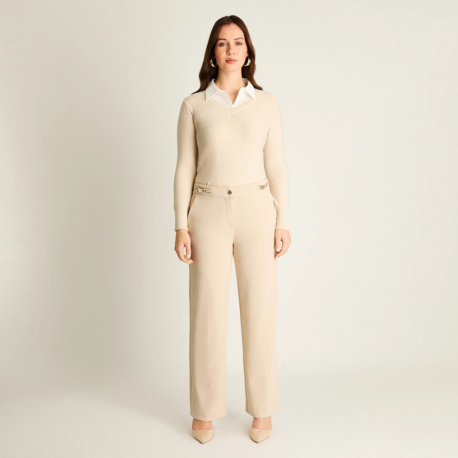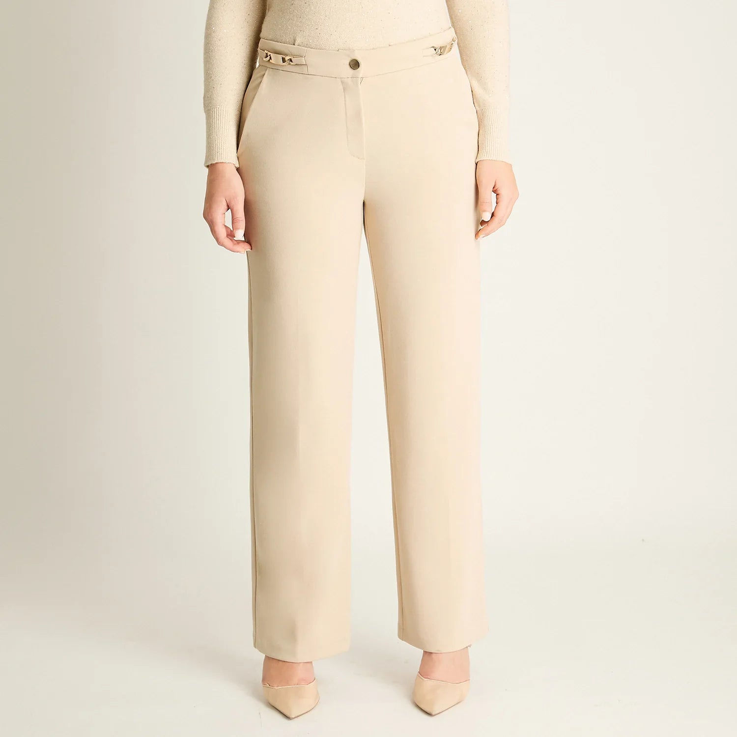 El pantalón formal color arena de la colección Cherry Lady de Lorenzo di Pontti combina elegancia y comodidad con su corte recto y calce ajustado. Hecho con una mezcla de poliéster y elastano, ofrece estructura firme y flexibilidad para moverte con libertad. Sus bolsillos laterales, presillas y cierre con botón suman funcionalidad y estilo. Perfecto para un look profesional en primavera, se adapta fácilmente a blusas livianas o camisas estructuradas, realzando tu figura con naturalidad en cada ocasión.