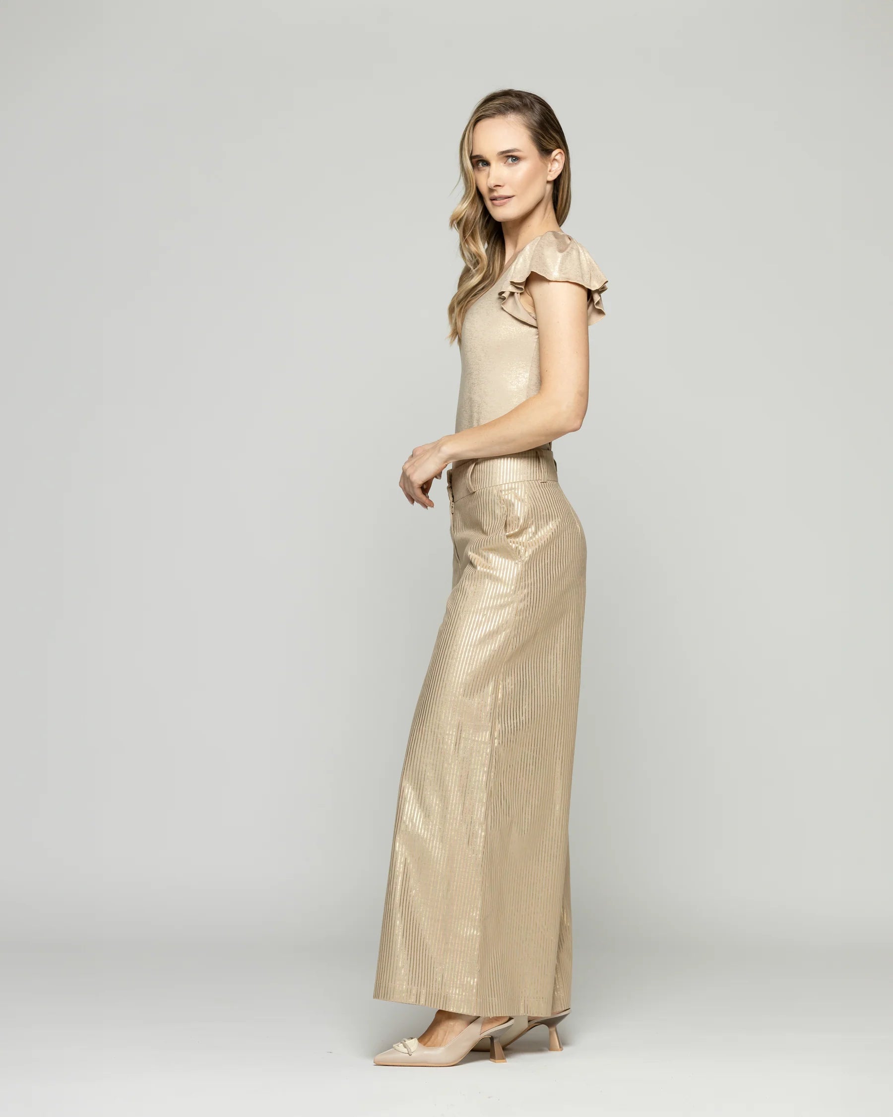 Este pantalón palazzo de algodón en tono beige Folia combina elegancia y comodidad con su corte amplio y tiro alto que realza la figura alargando las piernas. Su acabado metalizado de finas líneas aporta un brillo sutil, perfecto para destacarte en eventos nocturnos o darle un toque sofisticado a tu look diario. La pretina estructurada y cierre oculto aseguran un ajuste impecable, mientras que su versatilidad te permite combinarlo fácilmente con blusas neutras, chaquetas de cuero o blazers, convirtiéndolo en una pieza clave para cualquier ocasión especial.