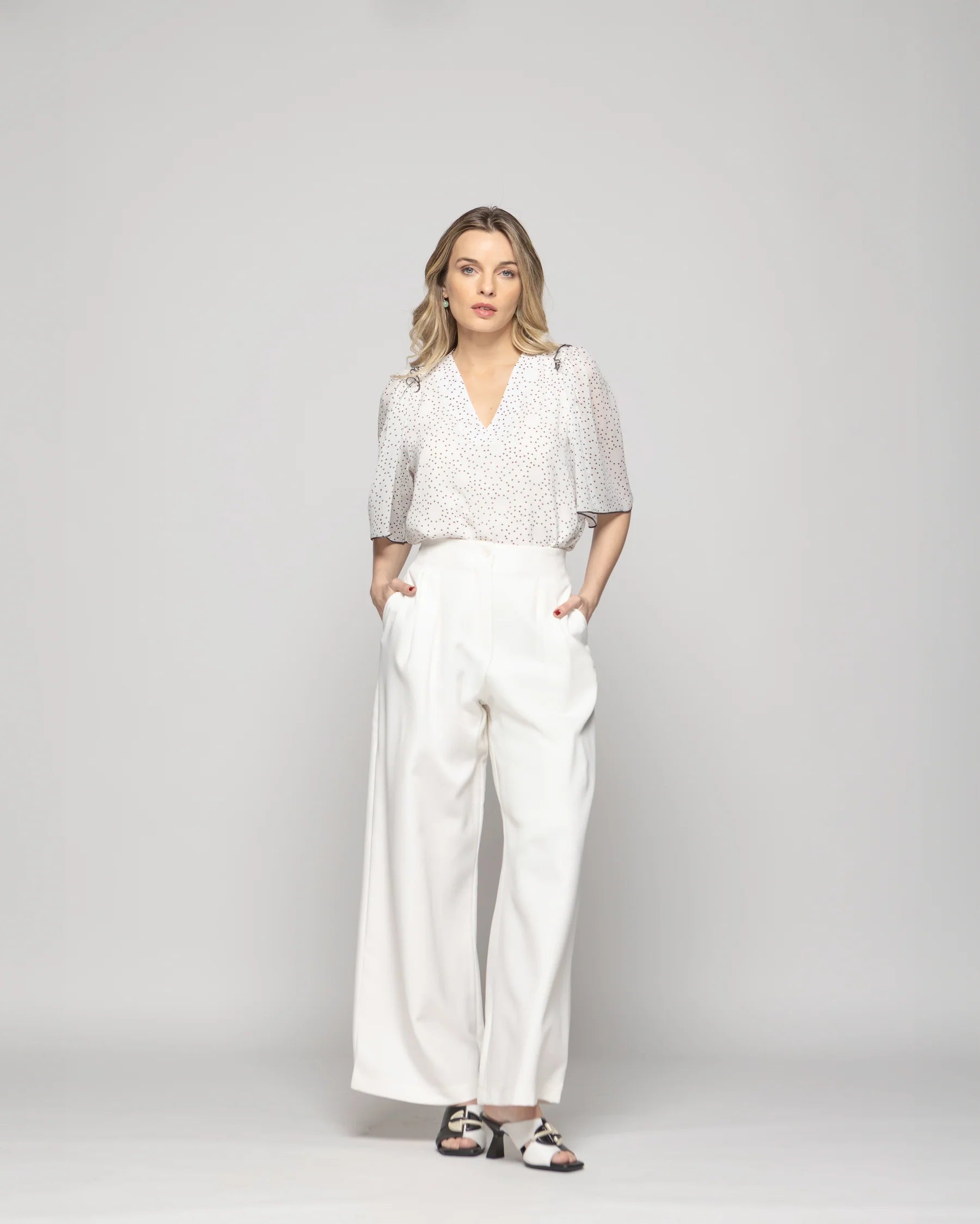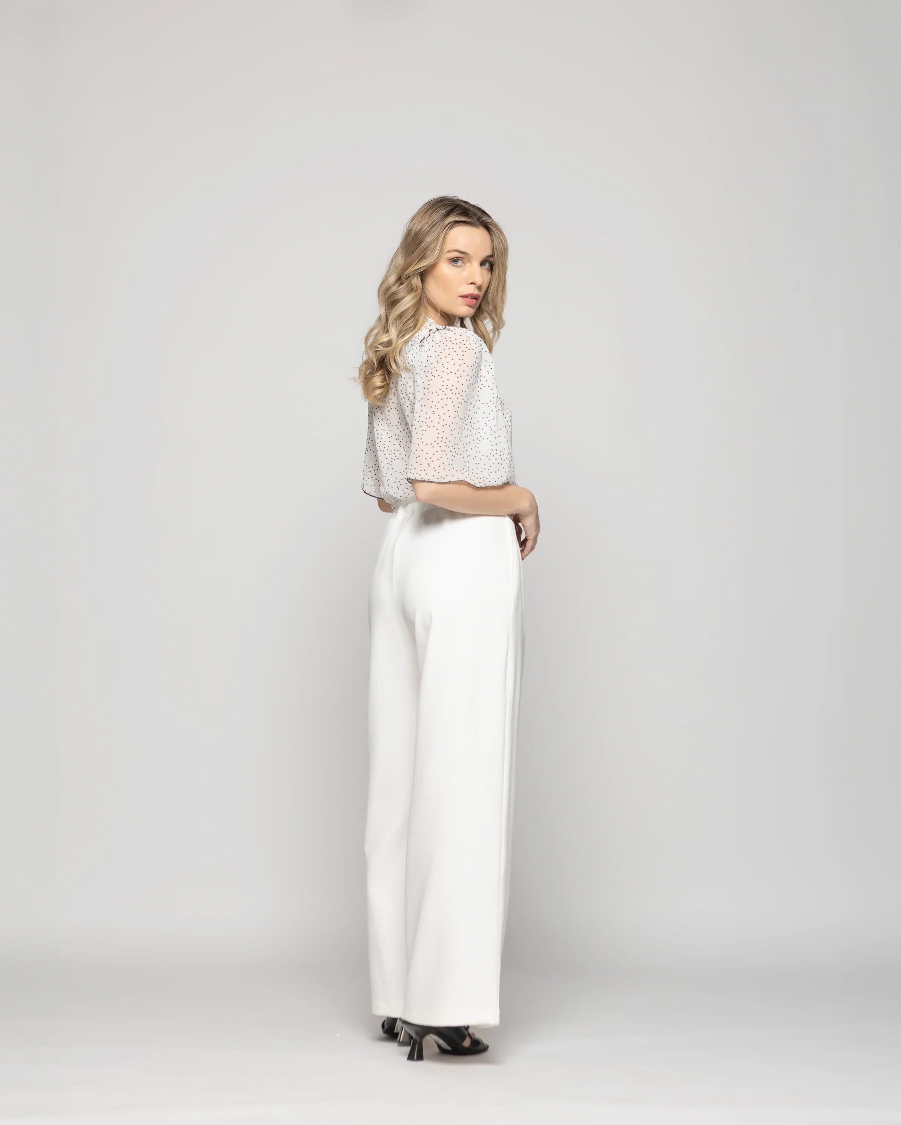 Este pantalón tipo palazzo en blanco crudo combina elegancia y comodidad con su tejido suave y liviano. Su corte amplio y tiro alto realzan la figura, mientras las pinzas frontales añaden un volumen sutil que define la silueta. Ideal para combinar con tops o blusas, transforma cualquier look en una propuesta sofisticada, perfecta tanto para la oficina como para salidas casuales. Un básico versátil que aporta estilo y frescura a tu guardarropa.