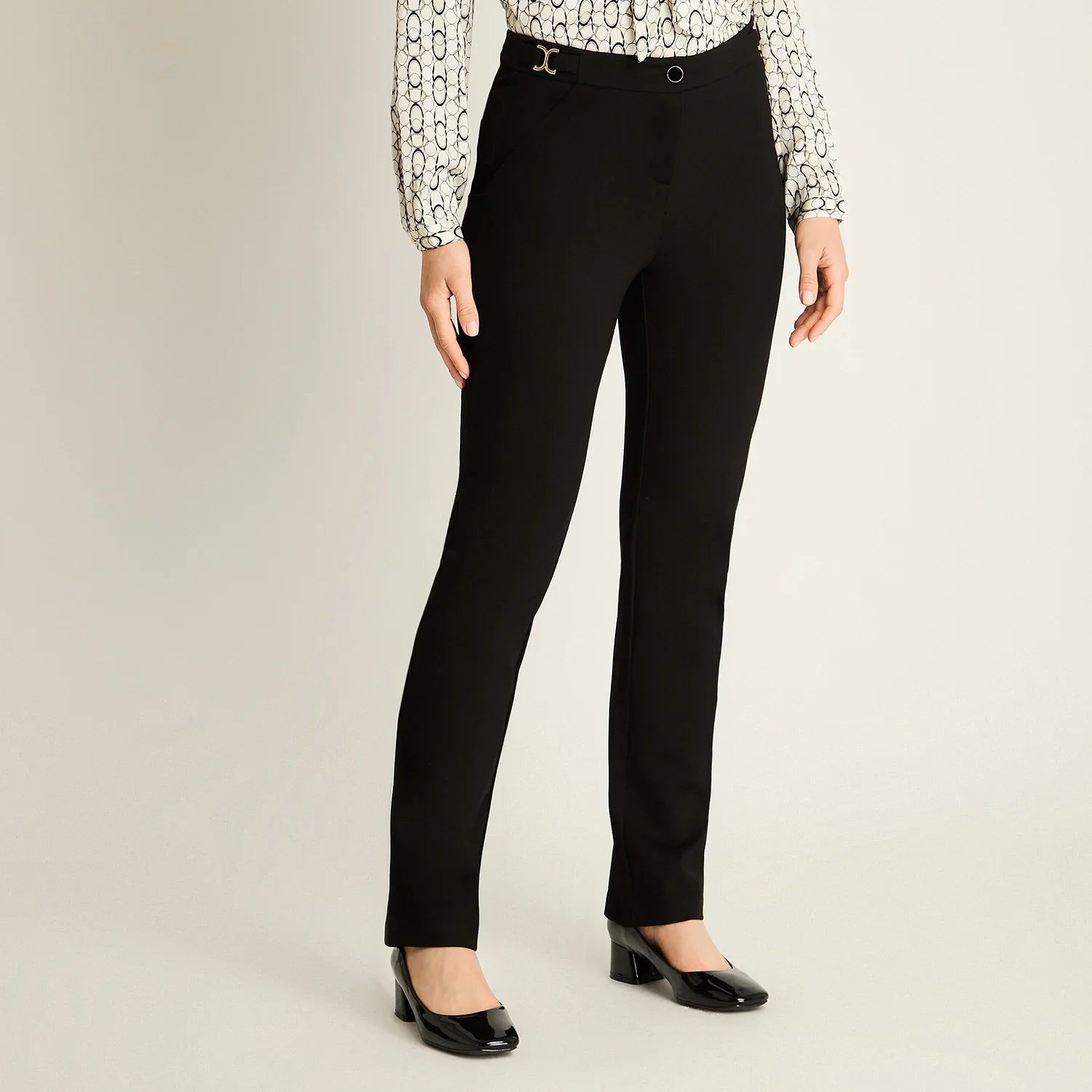 El Pantalón Negro Recto de Lorenzo di Pontti combina un diseño clásico con comodidad excepcional, ideal para tu jornada profesional. Su corte recto y calce normal realzan tu figura mientras permiten libertad de movimiento. Confeccionado en una mezcla de viscosa, poliamida y spandex, ofrece elasticidad media que garantiza confort durante todo el día sin perder elegancia. El detalle en los pasadores frontales aporta un toque sofisticado y versátil, perfecto para crear conjuntos con blusas o blazers que reflejen tu estilo profesional y seguro.