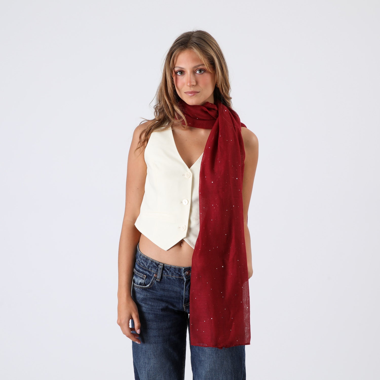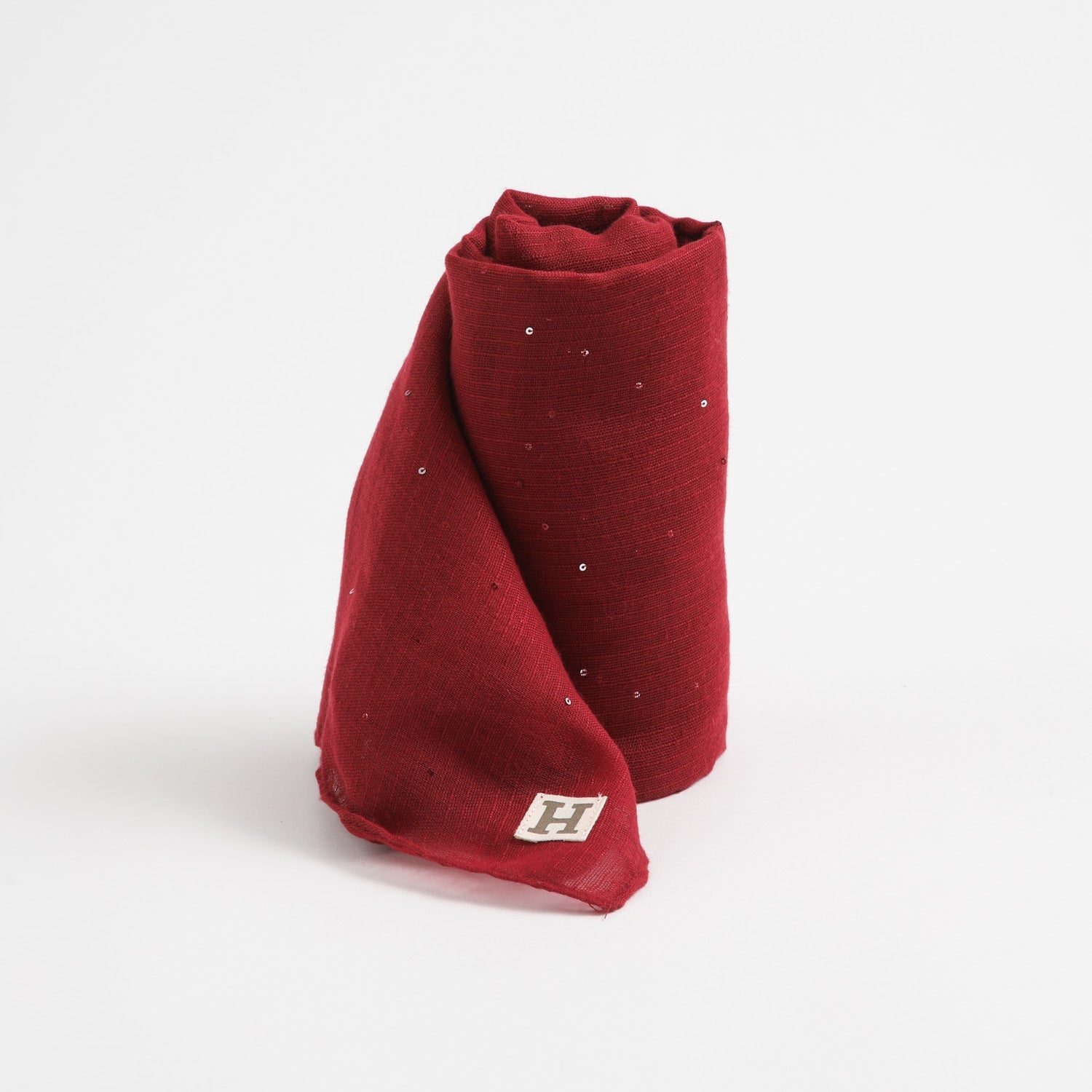 Este pañuelo en tono burdeos destaca por su textura delicada y suave. Presenta un diseño elegante con finas líneas adornadas con pequeñas lentejuelas que aportan un brillo sutil. Su borde acabado con dobladillo asegura un toque sofisticado y duradero.