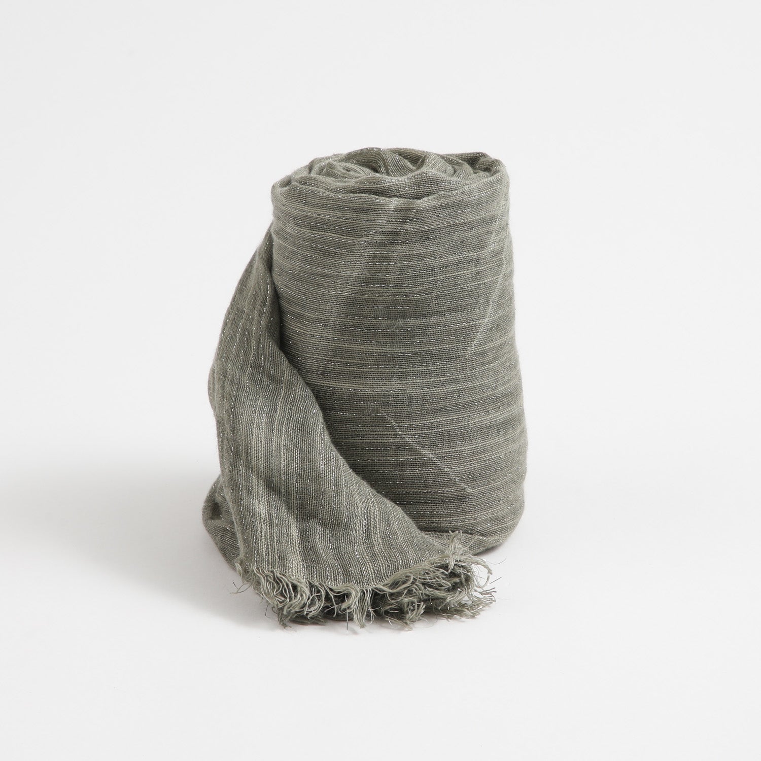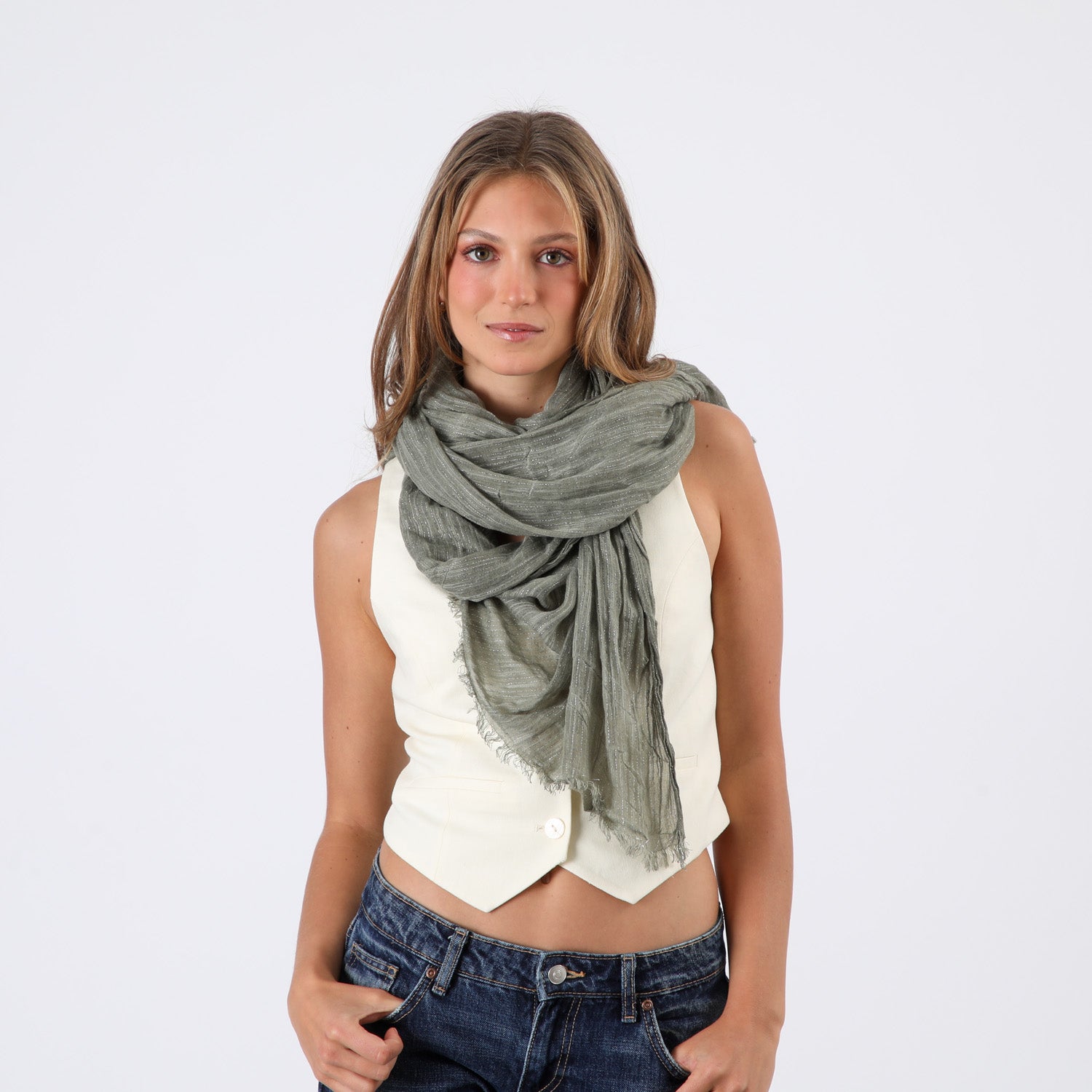 Pañuelo verde con textura plisada y suave al tacto. Presenta un diseño lineal en detalles plateados que aportan elegancia. Terminado con flecos que realzan su estilo único.