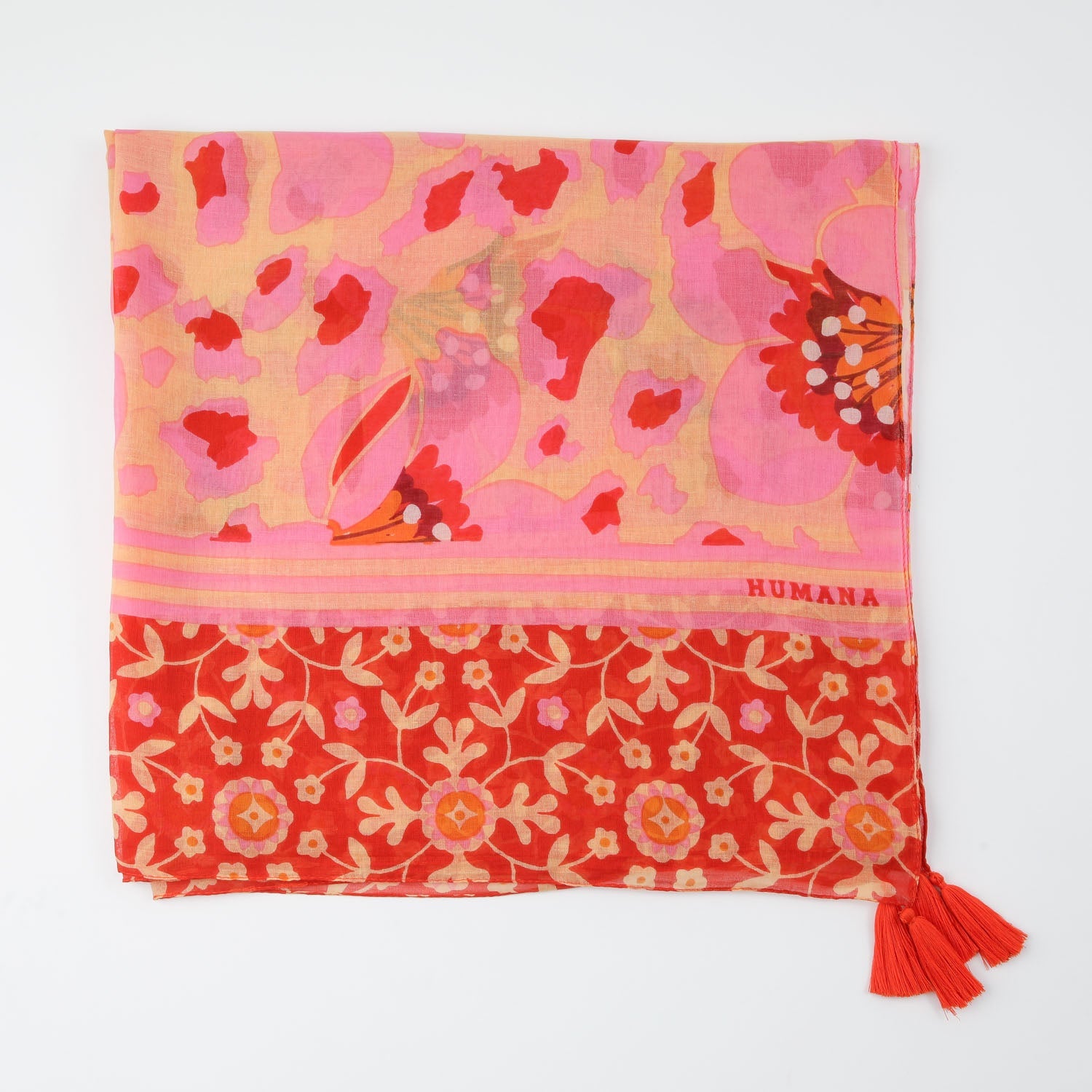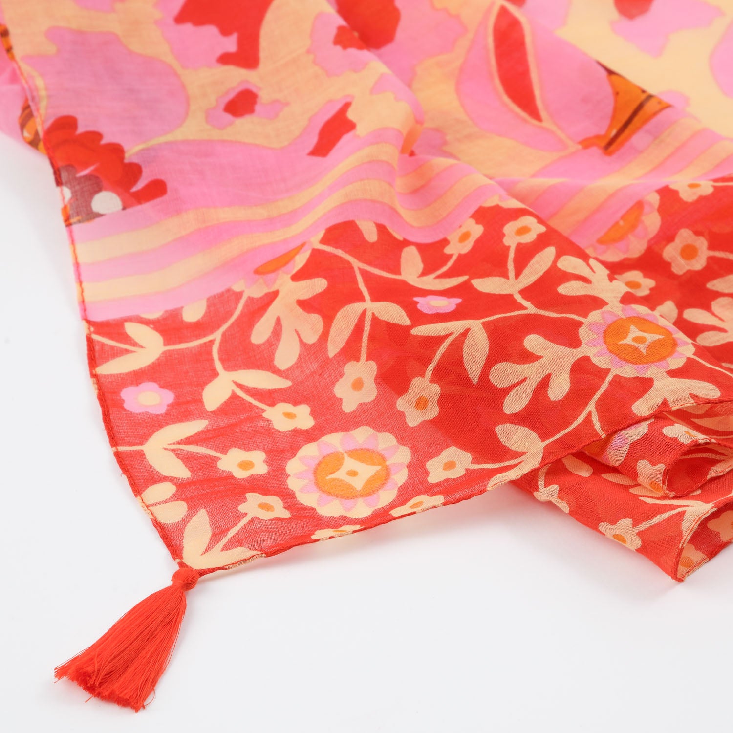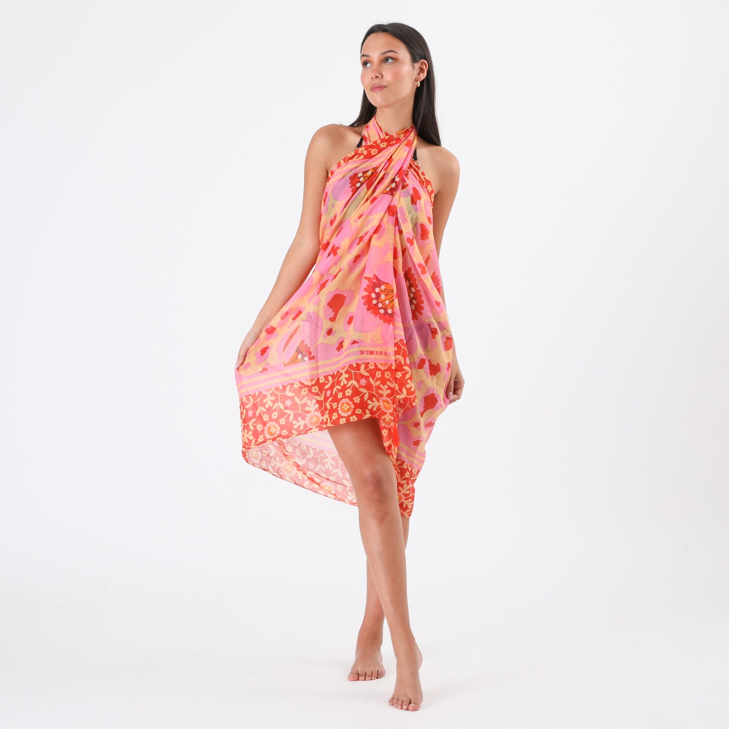 Este pareo en tonos naranjas presenta un vibrante diseño de estampado leopardo combinado con motivos florales tropicales, adornado con bordes de patrón floral geométrico. Sus esquinas terminan en elegantes borlas a juego, aportando un toque de estilo y sofisticación.