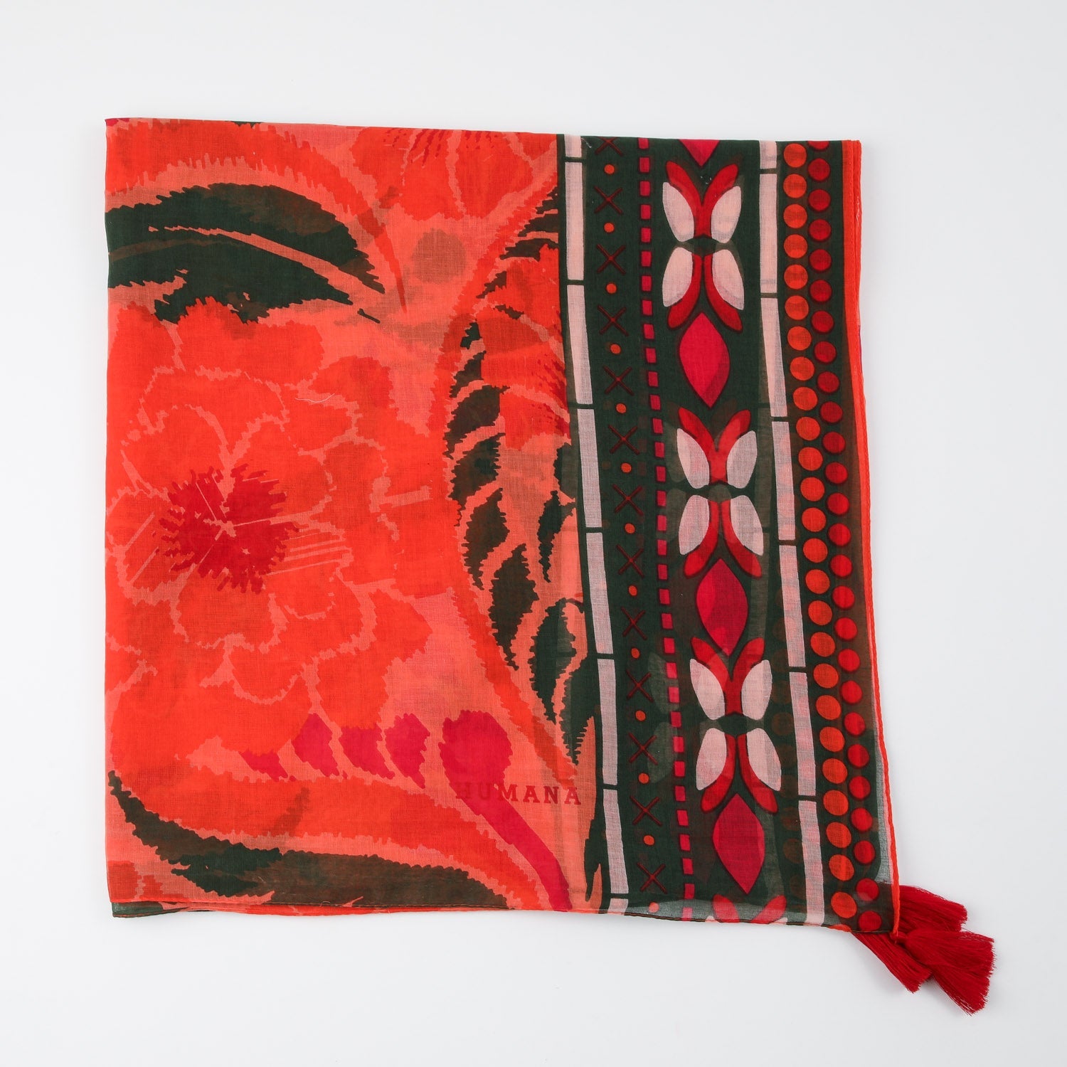 Pareo en tono naranjo que presenta un diseño paisley floral acompañado de bordes con figuras geométricas. Sus esquinas están decoradas con borlas a juego, aportando un toque elegante y armonioso.