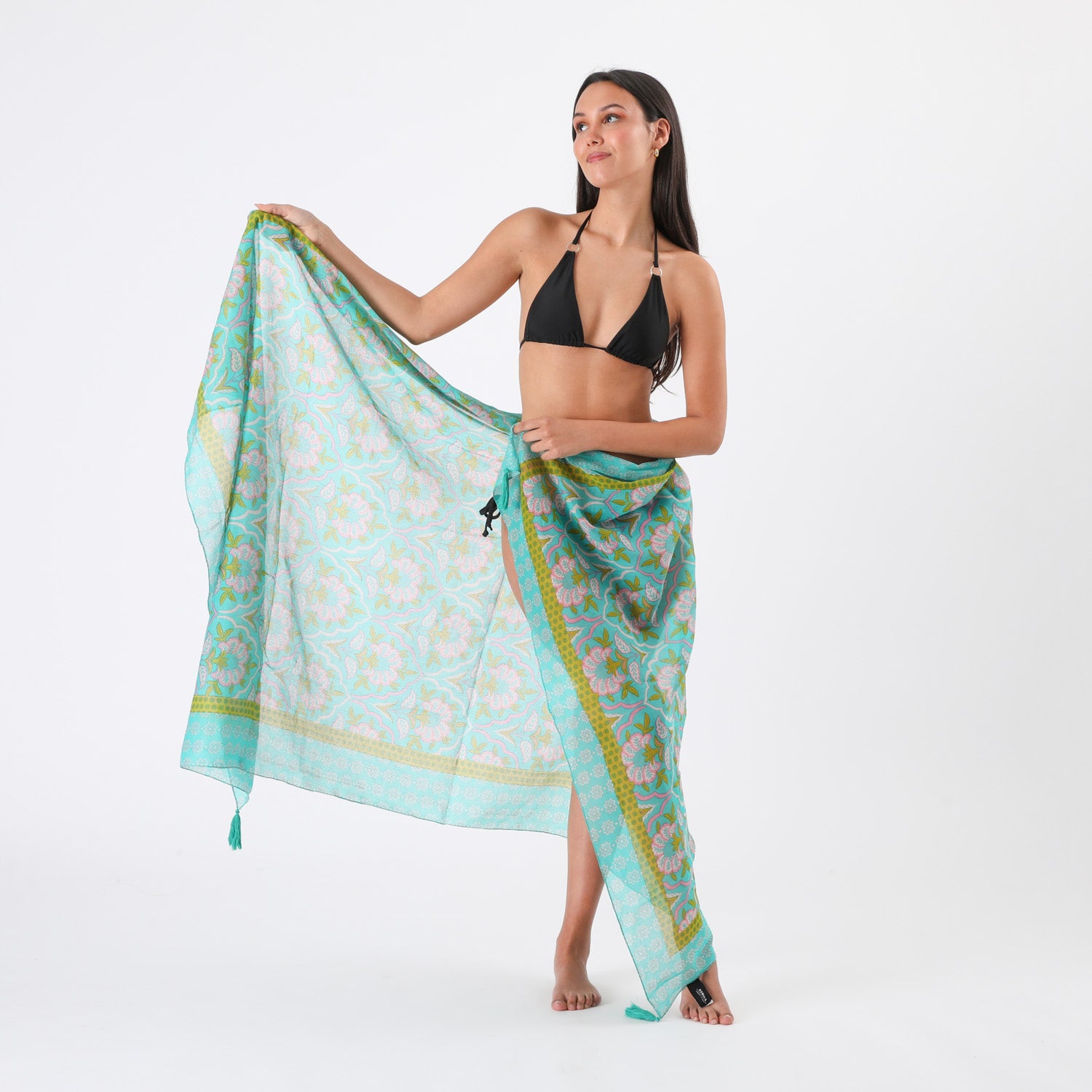 Pareo Calipso con un diseño floral tipo mosaico y detalles de mandalas en los bordes. Cuenta con acabados en borlas a juego en las esquinas, que realzan su estilo único y lleno de color.