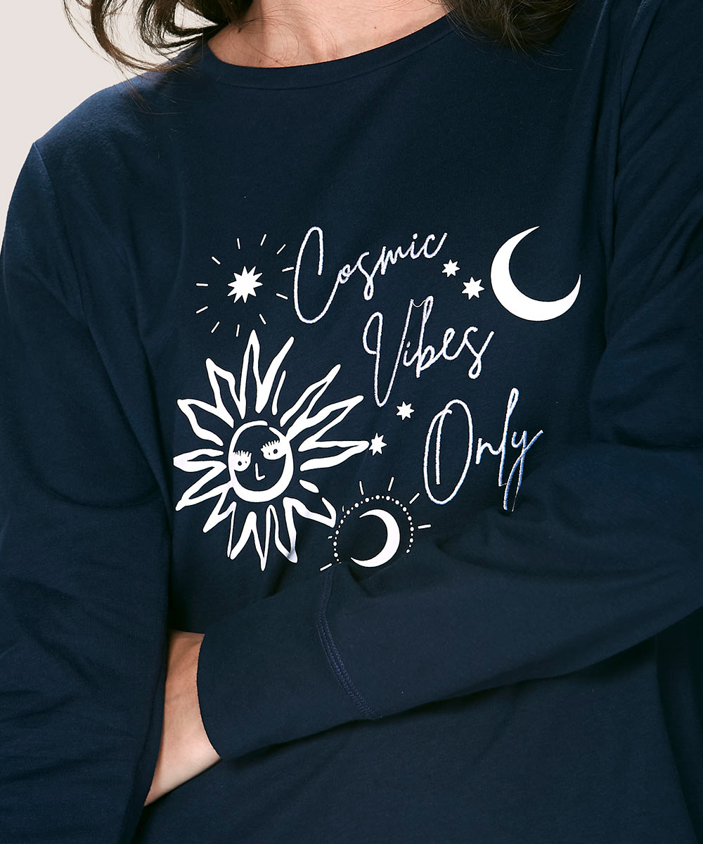 Pijama de dos piezas confeccionado en algodón de alta calidad, diseñado con motivos astrológicos que capturan la esencia cósmica. La polera de manga larga presenta un estampado detallado, mientras que el pantalón incorpora bolsillos funcionales para mayor practicidad. Tejido suave y transpirable que proporciona comodidad durante toda la noche, adaptándose perfectamente a los cambios de temperatura. Una opción versátil y elegante para el descanso contemporáneo.