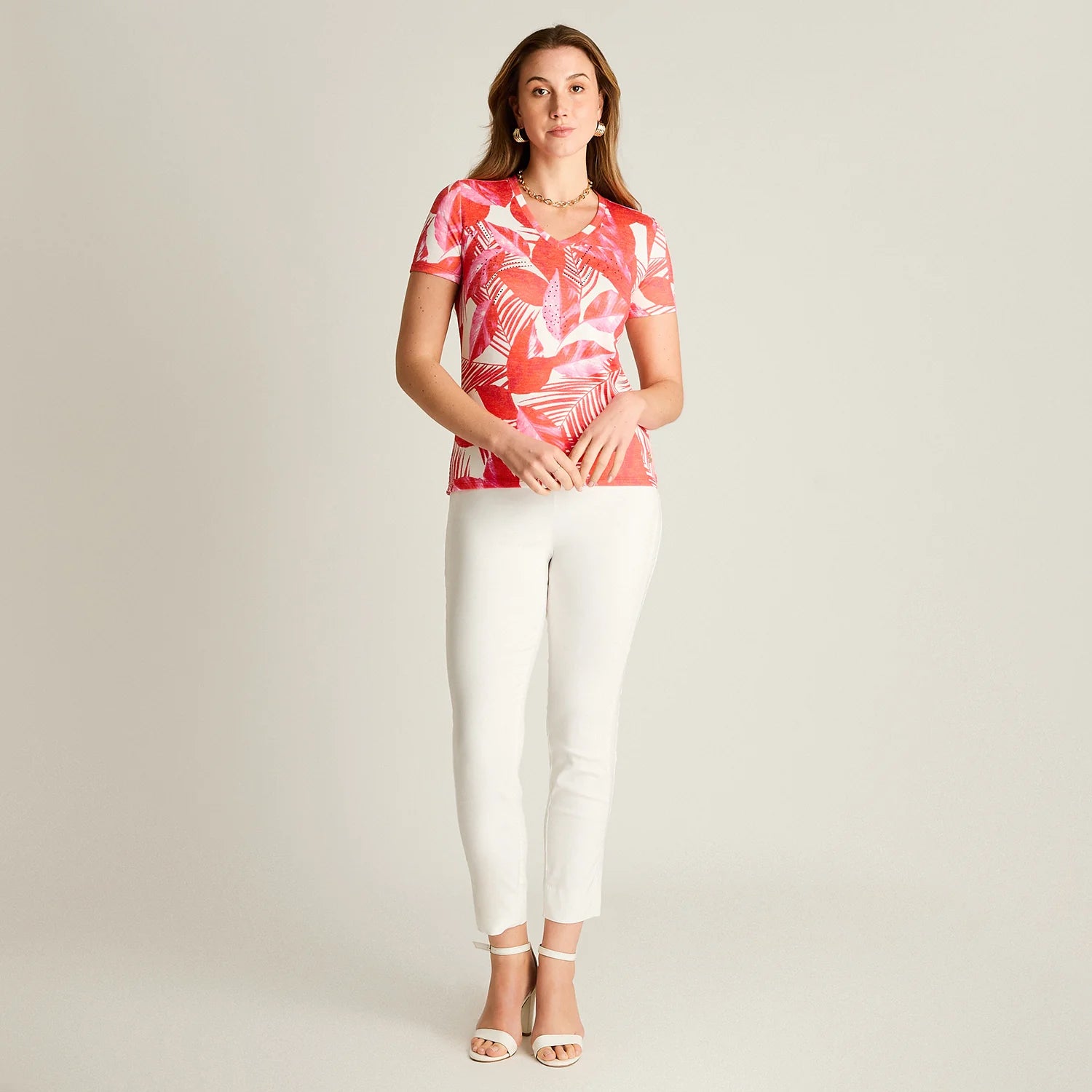 Esta polera roja de mujer presenta un estampado tropical sofisticado que aporta color y frescura a tu día a día. Diseñada para realzar tu figura con elegancia, ofrece un calce cómodo y un tejido con elasticidad media que facilita el movimiento. El escote en V y la caída suave le entregan un estilo moderno y favorecedor, ideal para quienes buscan combinar comodidad y sofisticación en una sola prenda.
