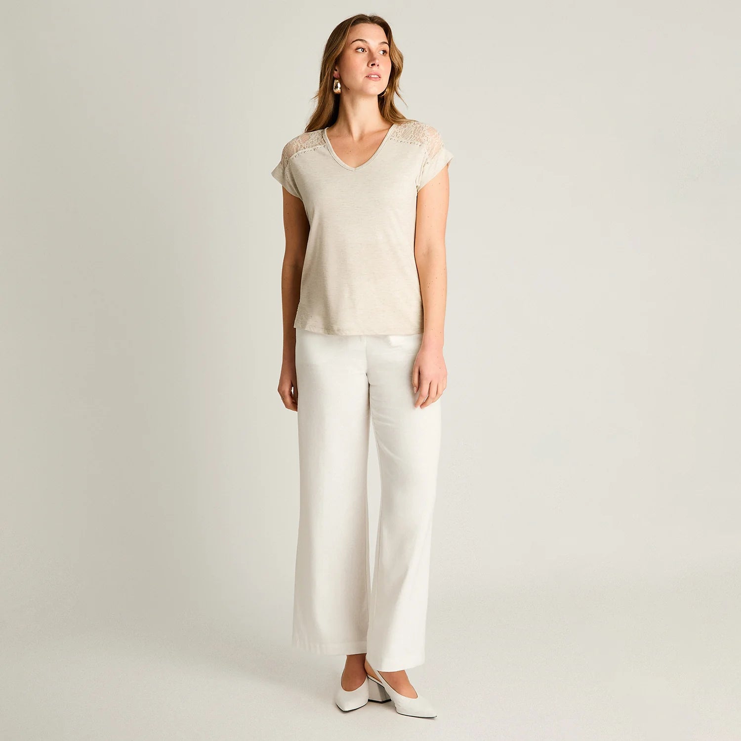 Polera beige para mujer con detalle brillante | Lorenzo di Pontti Disfruta de comodidad y estilo en una sola prenda. Esta polera de manga corta combina poliéster reciclado, viscosa y hilos metalizados para un tejido ligero con un brillo sutil. Su escote en V y ajuste estándar realzan la figura, haciéndola ideal para looks tanto formales como casuales. Un toque de sofisticación para cualquier ocasión.