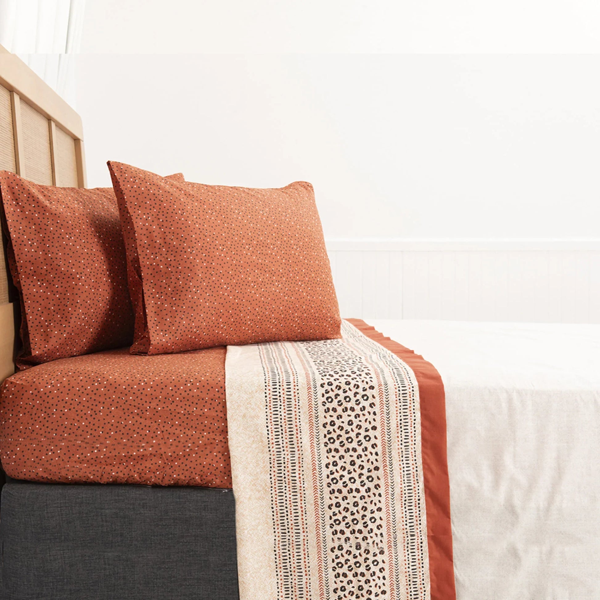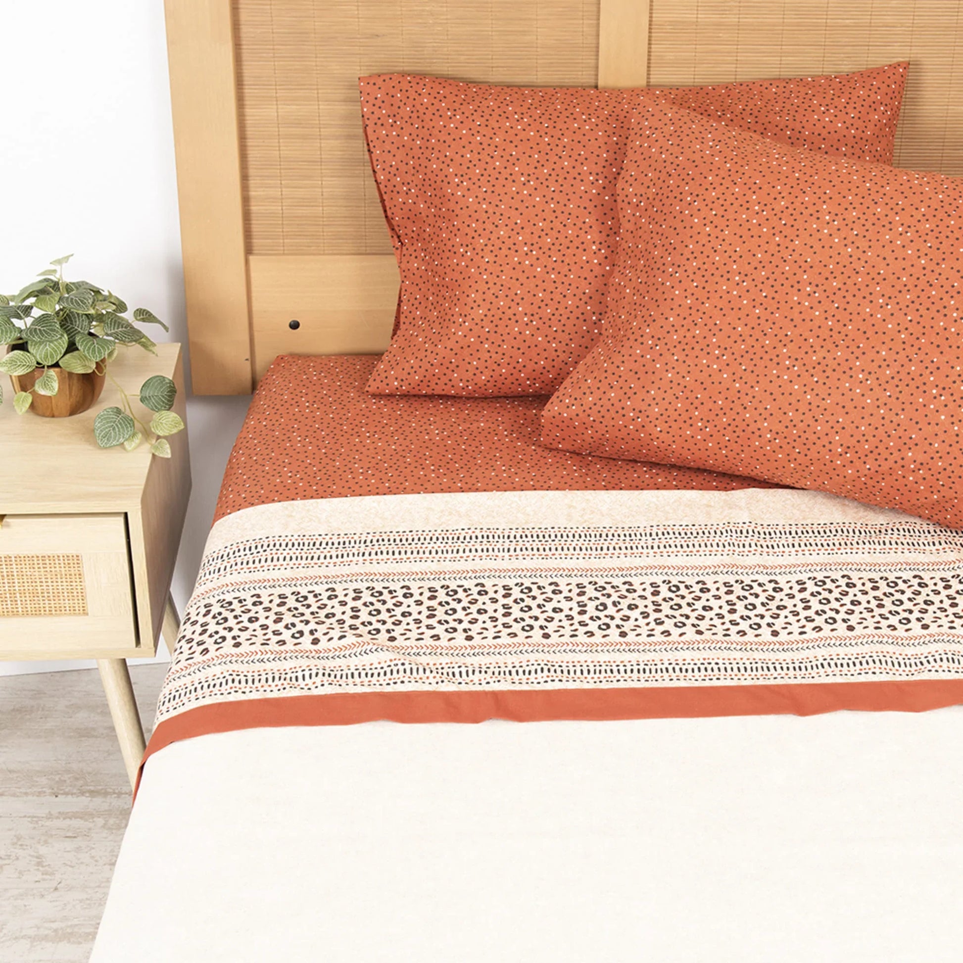 Disfruta de comodidad y estilo con esta sábana para 2 plazas de 144 hilos con estampado animal. Confeccionada en una mezcla suave y duradera de 50% algodón y 50% poliéster, ofrece un tacto agradable y fácil cuidado. El juego incluye sábana encimera, sábana bajera ajustable y dos fundas de almohada, garantizando un ajuste perfecto y completo para tu cama. Dale un toque moderno y acogedor a tu dormitorio con este atractivo diseño.