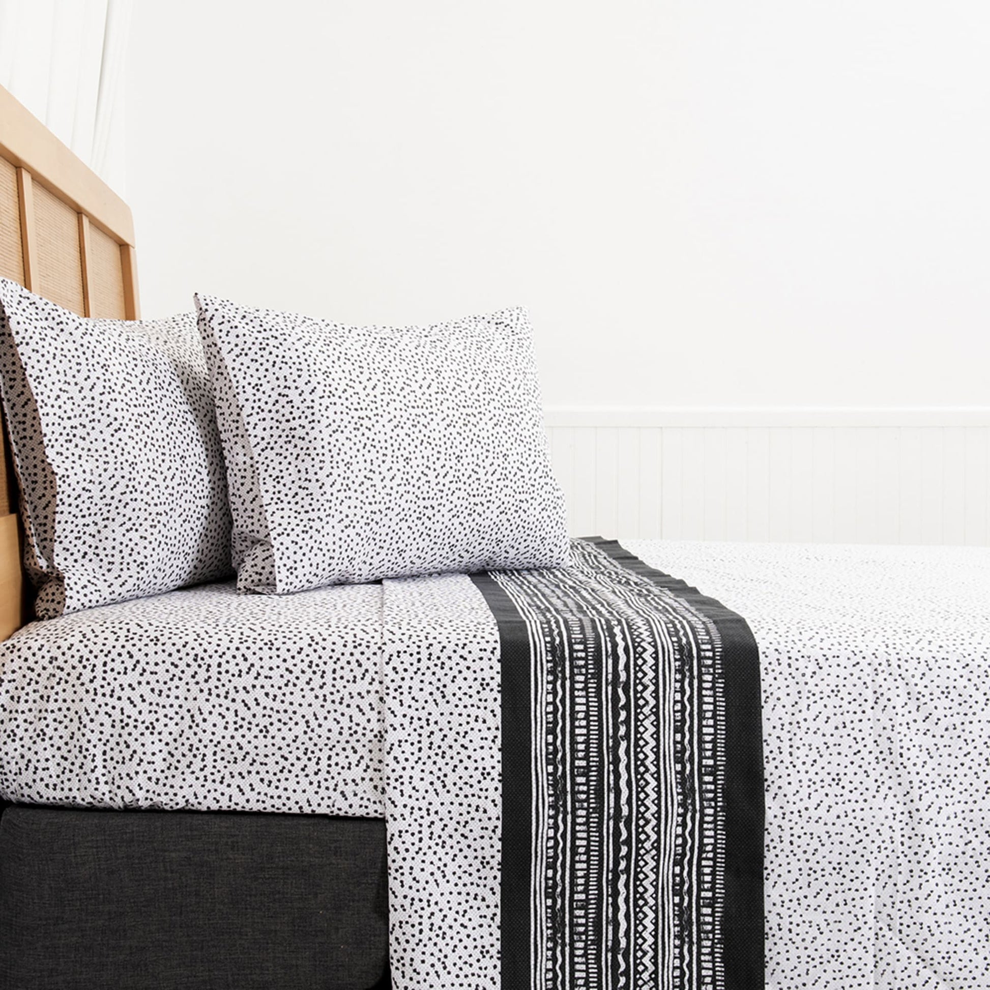 - Incluye: 1 Sábana Encimera, 1 Sábana Bajera, 2 Fundas de Almohada