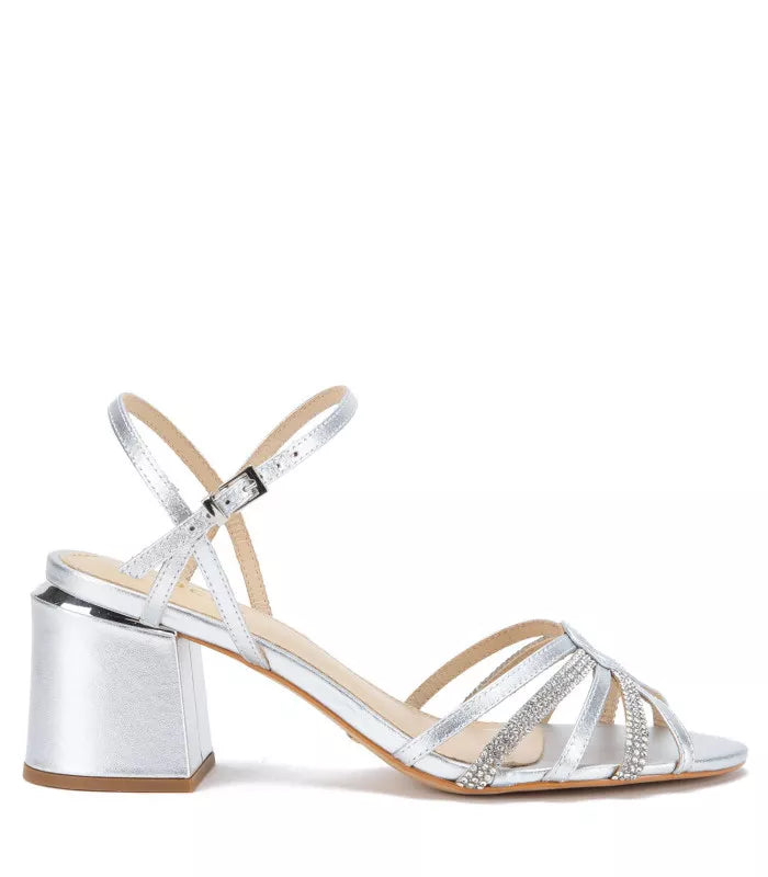 Cambias todo, menos esa elegancia natural. Sofisticación que se mueve contigo. La sandalia Isi en cuero metalizado color plateado destaca por sus delicadas tiras con aplicaciones y taco medio con toque metálico. Ideal para elevar tu look sin perder comodidad.