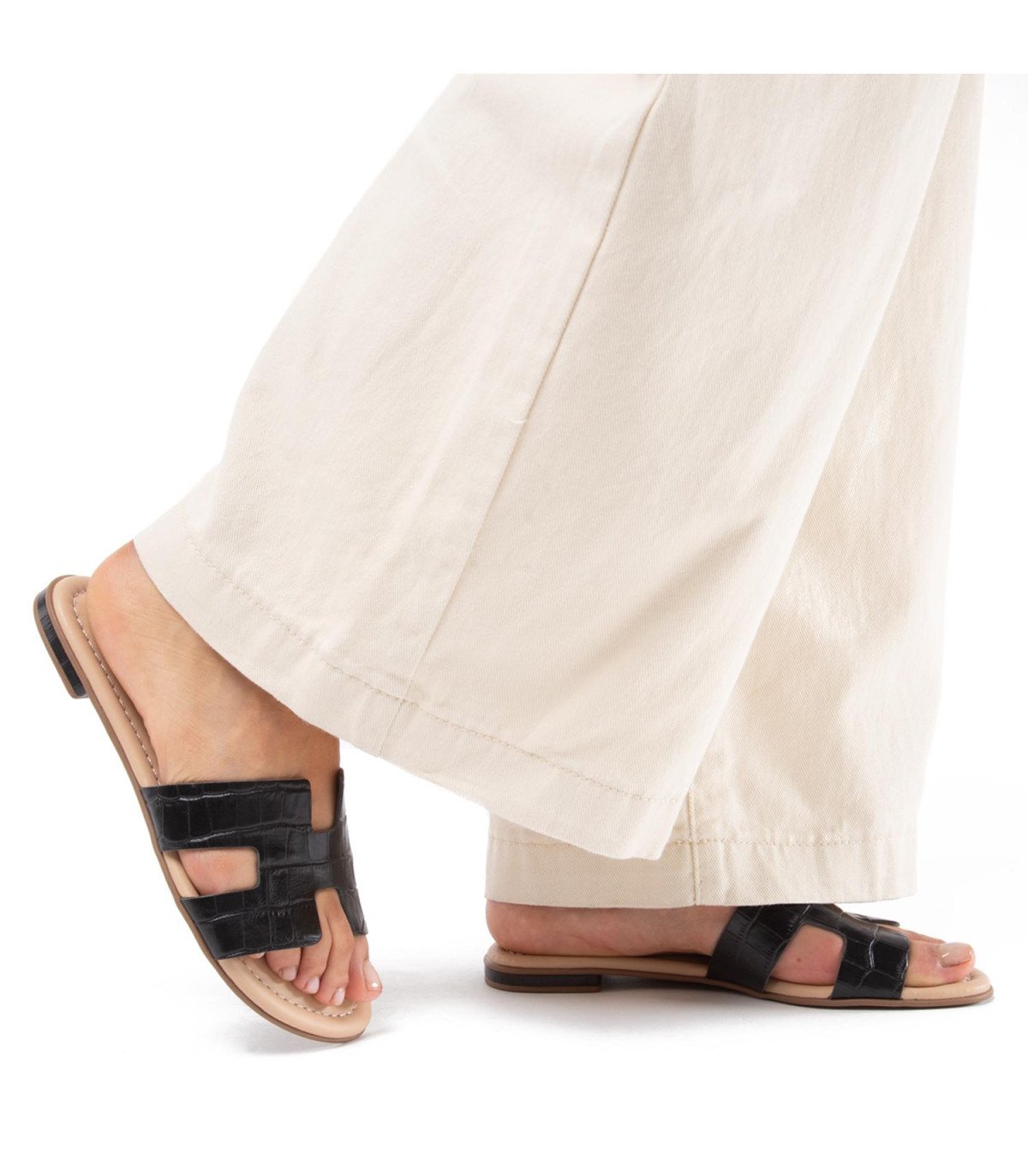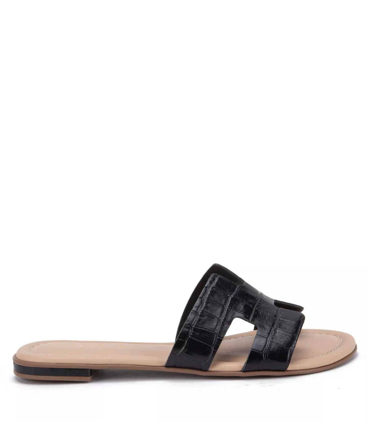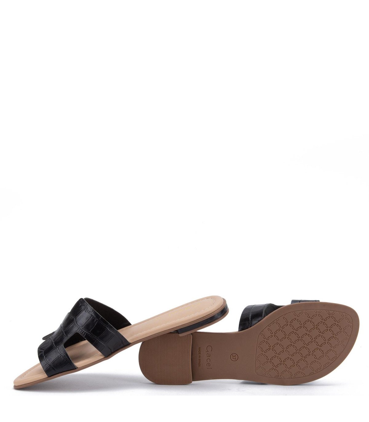 Transformas todo menos tu esencia. La sandalia Sandy para mujer, en cuero croco negro, es el complemento ideal para outfits que buscan simplicidad sin perder fuerza. Su diseño de planta plana y corte abierto ofrece comodidad y frescura en cada paso, combinando estilo y ligereza con naturalidad.