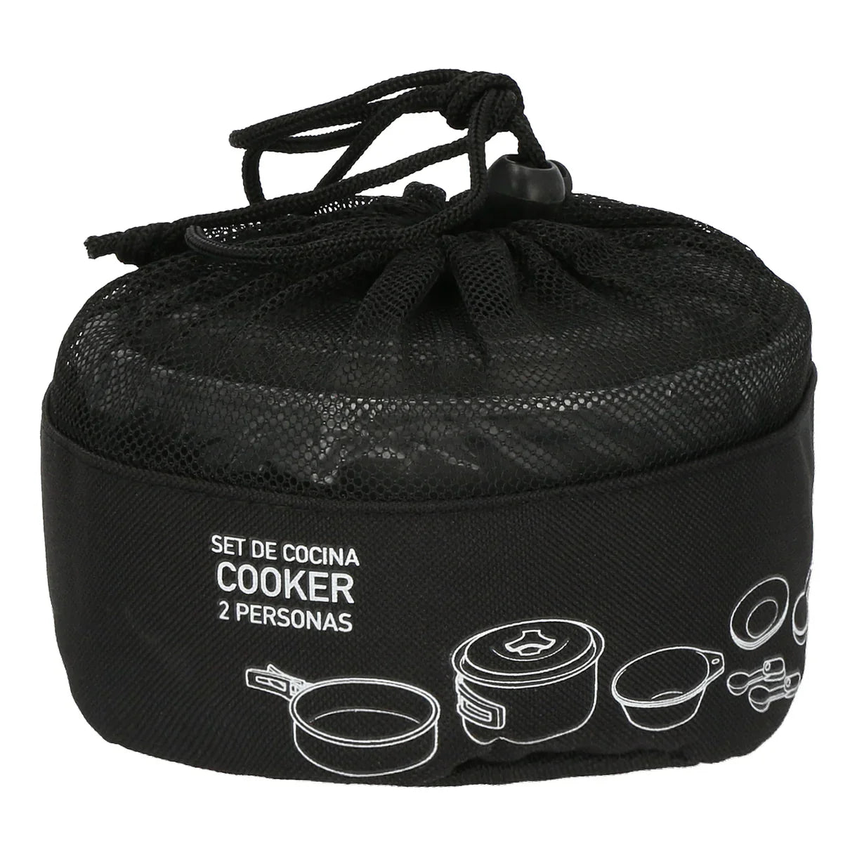 Set de Cocina Cooker para 2 Personas: equipo compacto y ligero (470 g) diseñado para camping, viajes y picnics. Incluye 9 piezas esenciales con utensilios de aluminio resistente y elementos de mesa en plástico duradero. Viene con bolso de transporte práctico para llevar todo lo necesario y preparar comidas completas en cualquier aventura al aire libre.