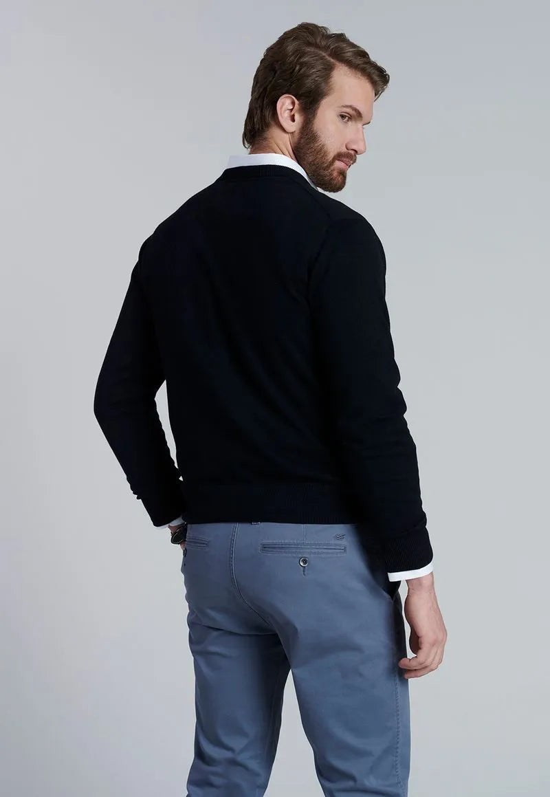 Este suéter es el complemento perfecto para cualquier guardarropa de hombre. Con su cuello en V y su diseño negro sólido, es una opción versátil y elegante para cualquier ocasión. Mantente abrigado y a la moda con este suéter de alta calidad.